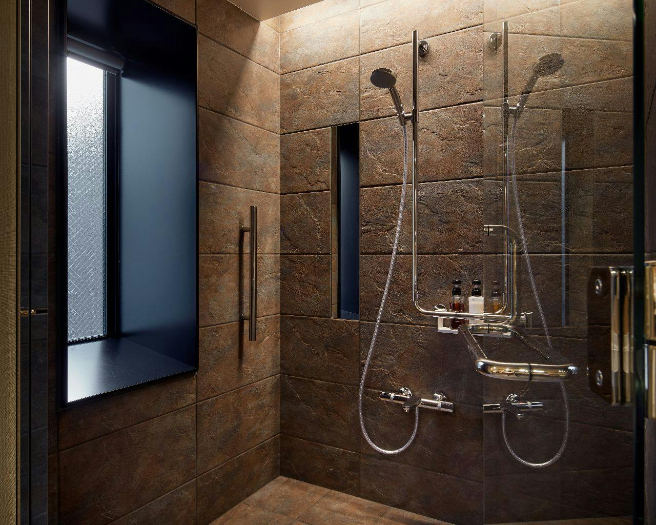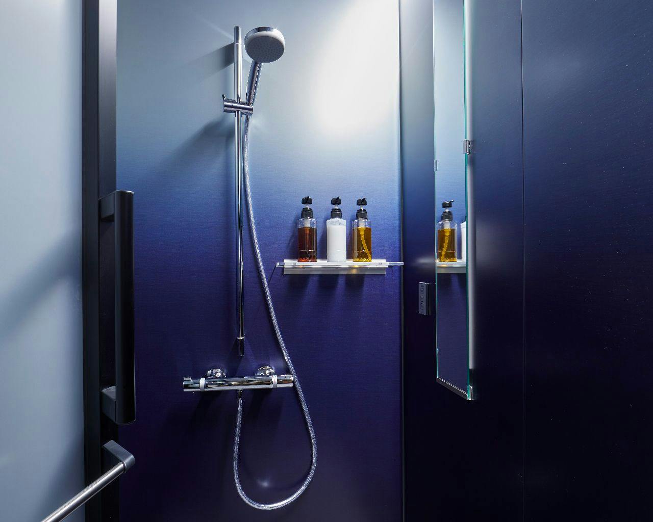 コーナーキング 1~3名 Wifi無料 禁煙日本間のような落ち着きをもった角部屋。フローリングに畳の小上がりを持つ空間で、3名様までお泊まりいただける、ゆったりくつろげる客間です。ゆったり広めのシャワーブースで、快適な浴び心地を追求したドイツ製の3段階切替シャワーヘッドを設置しております。全身にシャワーを浴びることで表面体温が高まり、よりぐっすり眠れる効果が期待できます。
