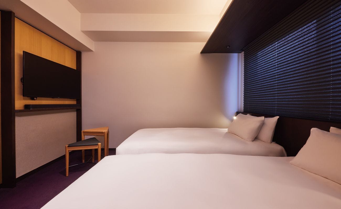 デラックスツイン 1~2名 Wifi無料 禁煙入り口付近に機能を集約し、寝室は寛ぐことに集中できる空間構成。オリジナルの三角形の家具は座る以外にも、お客さま自身で使い方を楽しめる家具です。ゆったり広めのシャワーブースで、快適な浴び心地を追求したドイツ製の3段階切替シャワーヘッドを設置しております。全身にシャワーを浴びることで表面体温が高まり、よりぐっすり眠れる効果が期待できます。