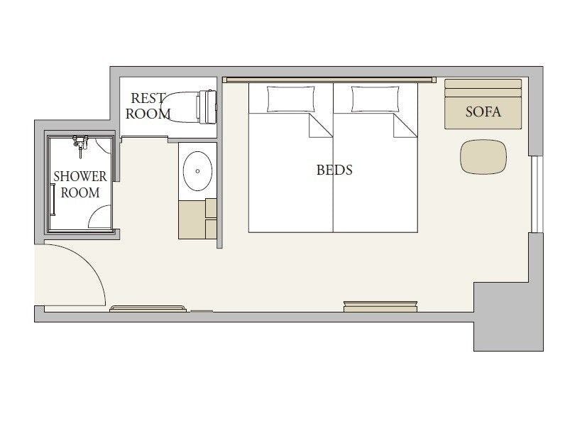 カップル・ファミリーの利用に最適なお部屋です。広めのツインルームになっております。お荷物が多いお客様におすすめです。ミストシャワーやマッサージシャワーが楽しめる多機能シャワー、ボリュームのある大粒シャワーが楽しめるオーバーヘッドシャワー、身体を芯から温めるボディーシャワーのついたシャワーブースタイプのお部屋になります。バスタブがない分、洗面台とトイレが完全に独立しているため、シャワーのみご利用のお客様におすすめです。