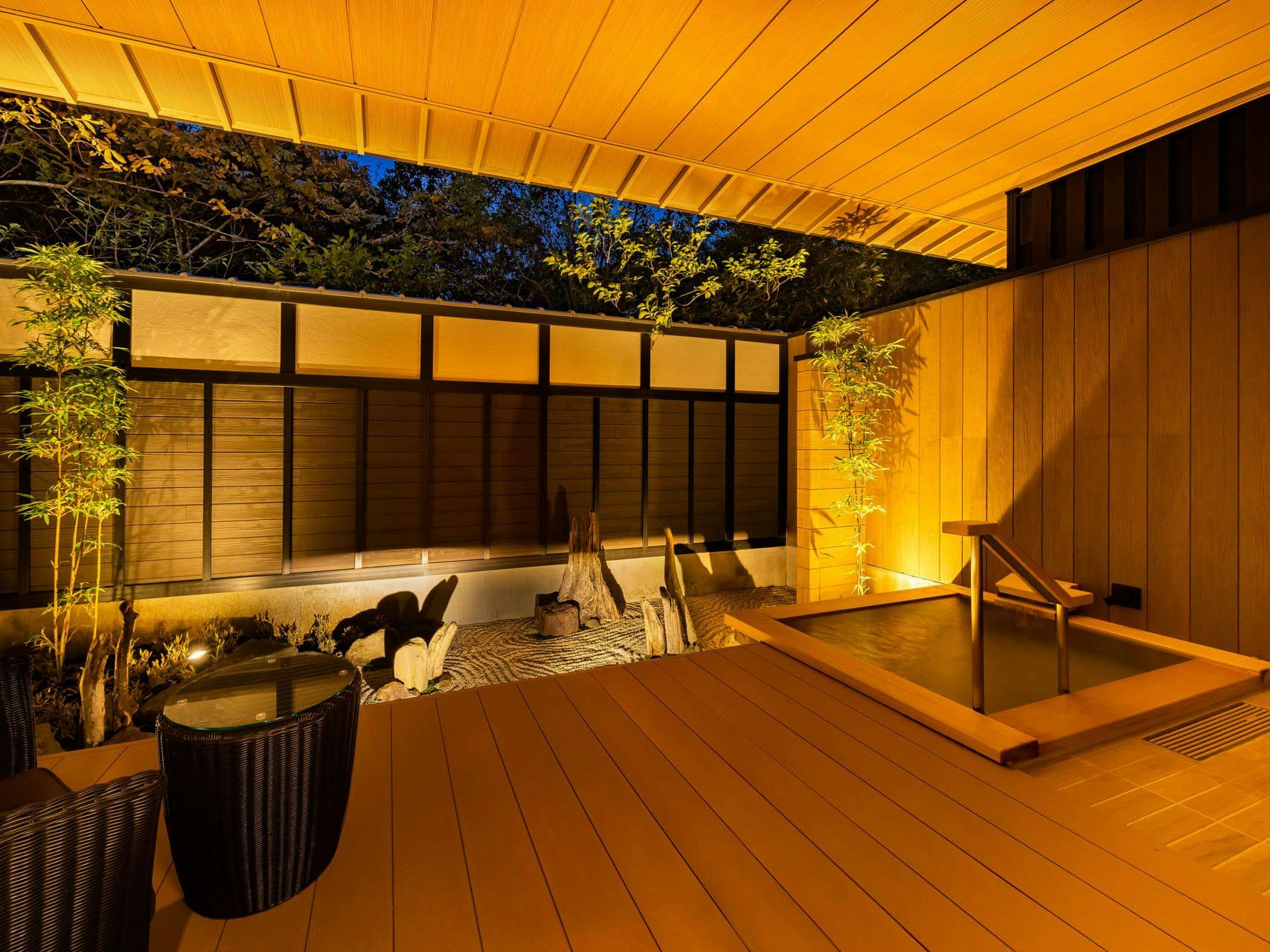 夜になると、ライトアップされた幻想的な枯山水を楽しむことができます。