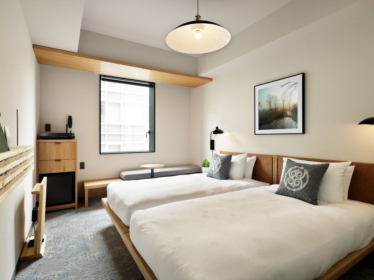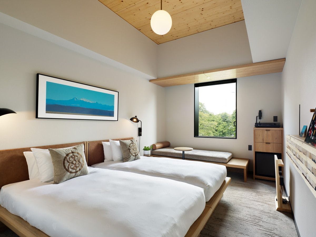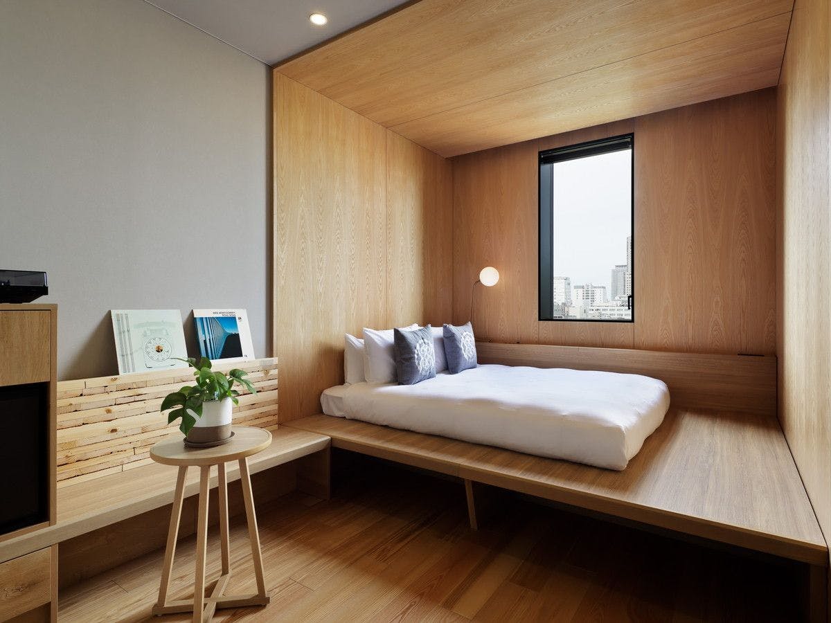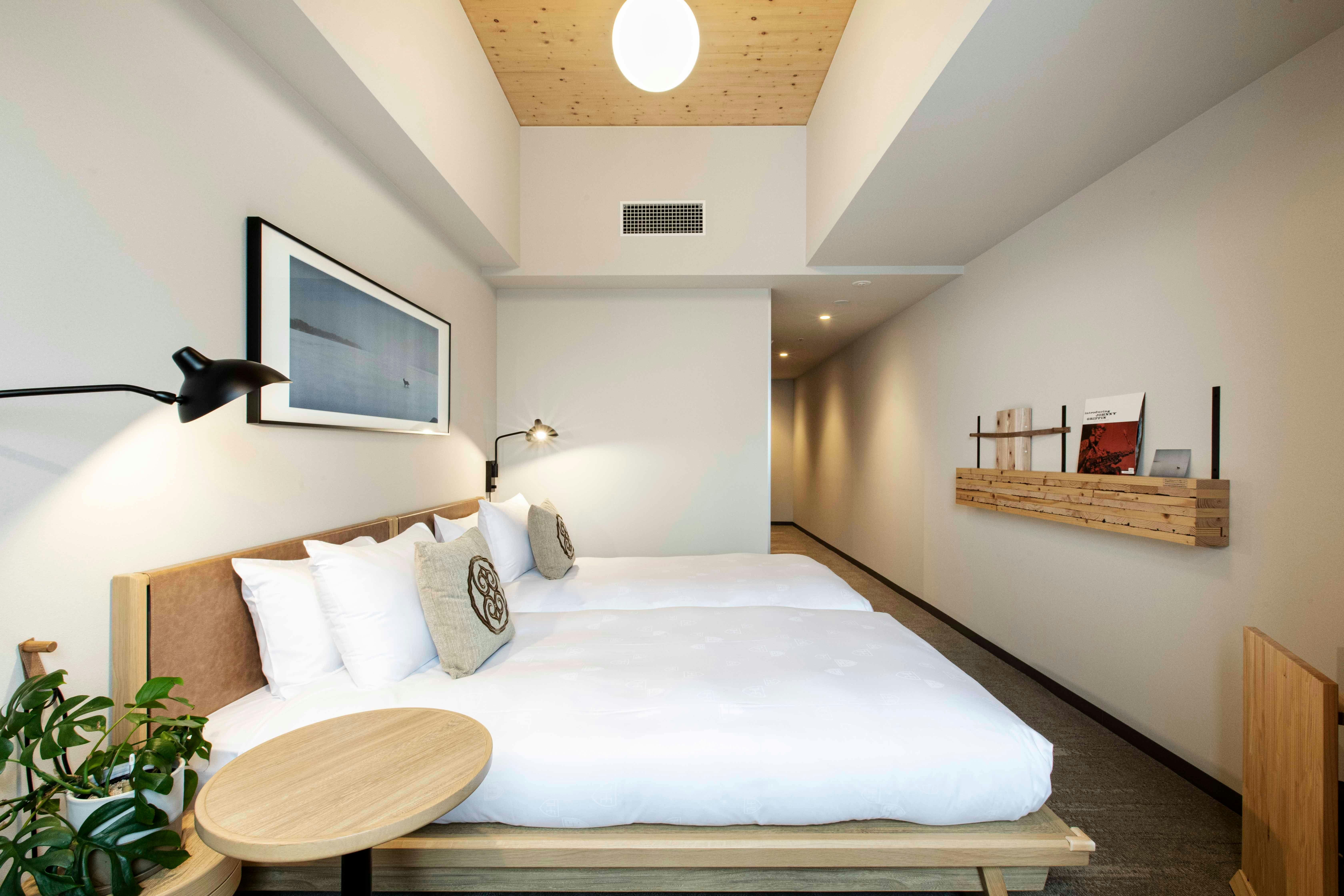 国内初の高層ハイブリッド木造ホテルの最上階に位置する木質感あふれるダブルルーム。