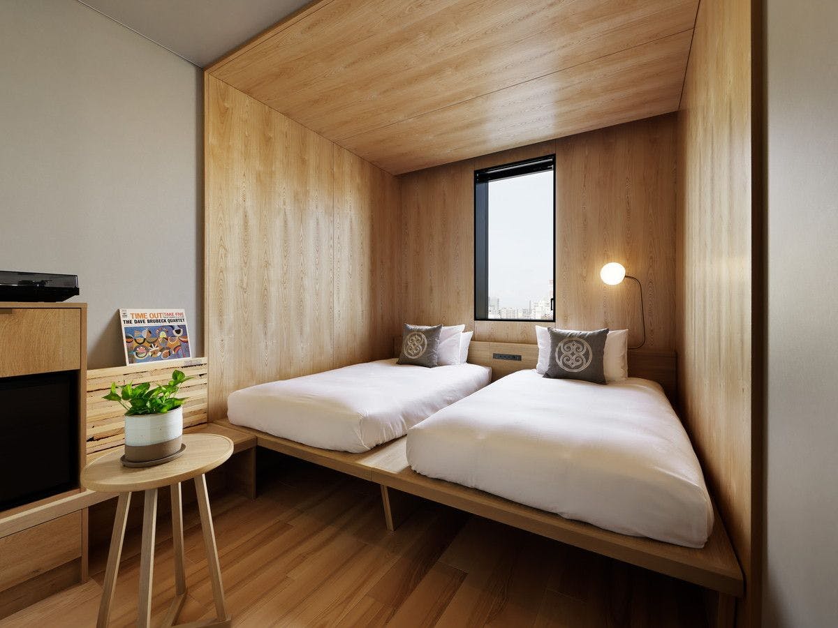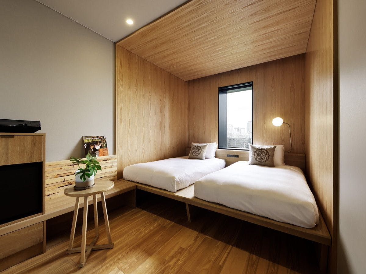 国内初の高層ハイブリッド木造ホテルの木質感あふれるコーナーダブル。