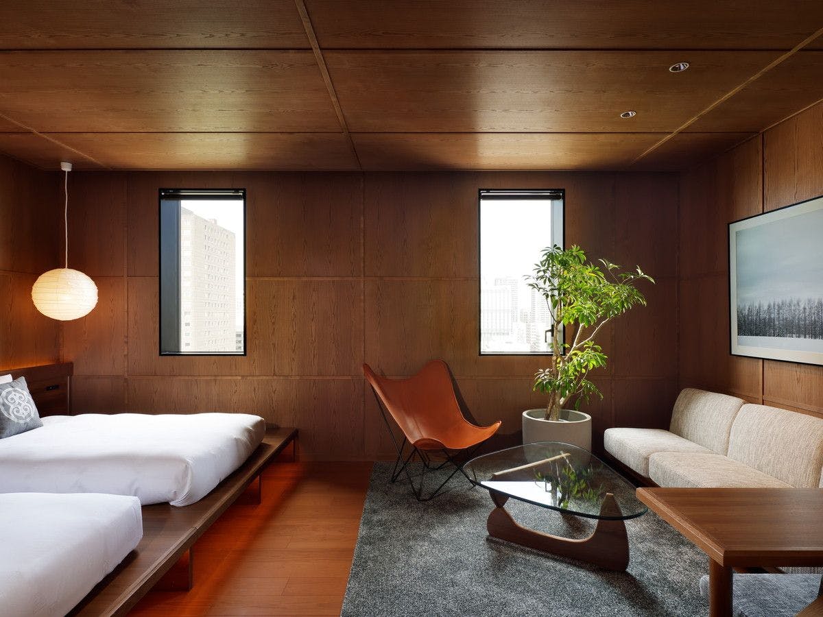 国内初の高層ハイブリッド木造ホテルの最上階に位置する、館内唯一のスイートルーム。木質の内装に囲まれた広々とした空間と、目の前に見えるテレビ塔が特別な一夜を演出。