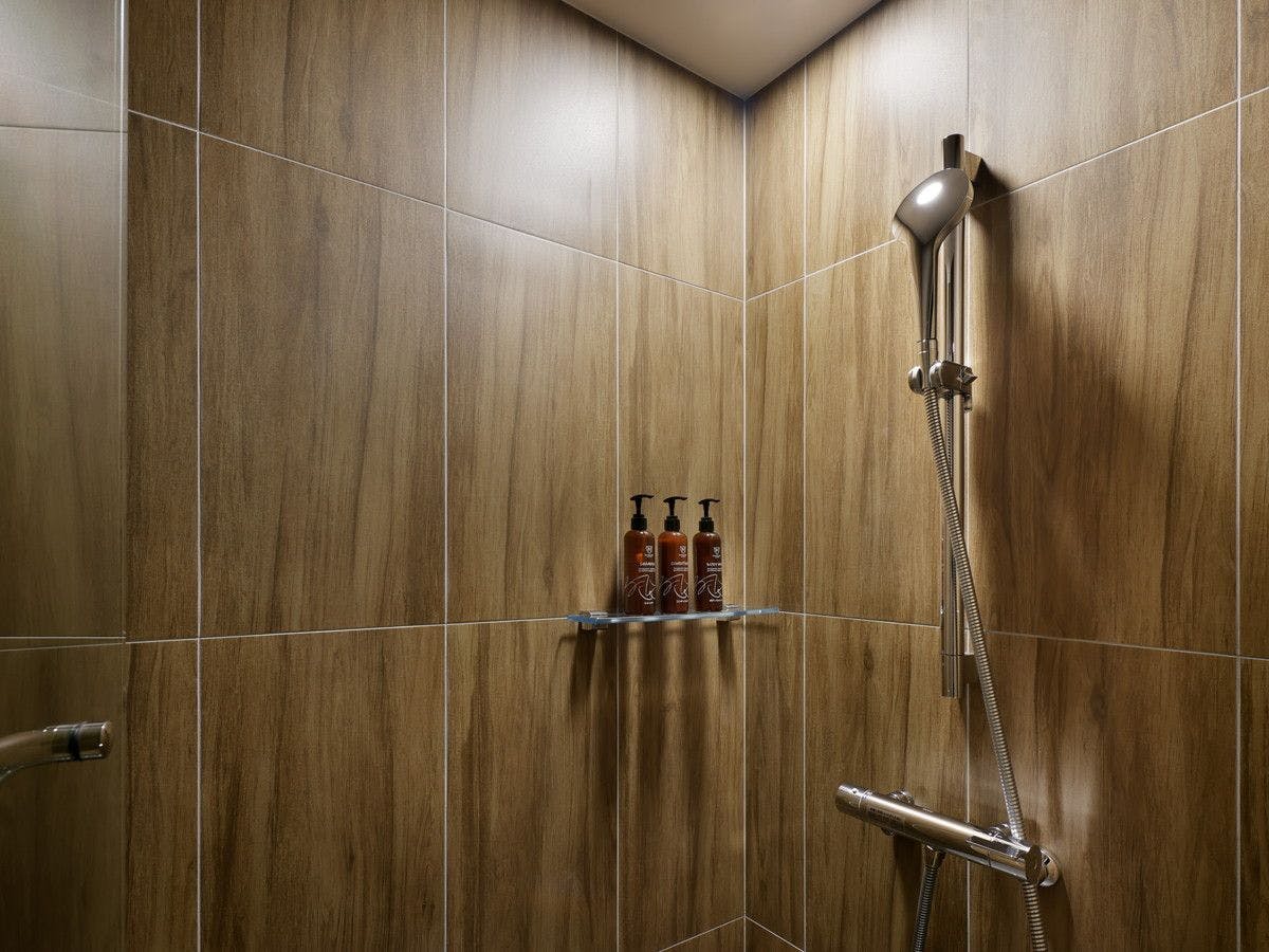 室内に北海道をテーマにしたアートピクチャが飾られたフロアで、洗い場付きのバスタブを備えるダブルルーム。北海道産木材を随所に使った優しい空間が魅力。