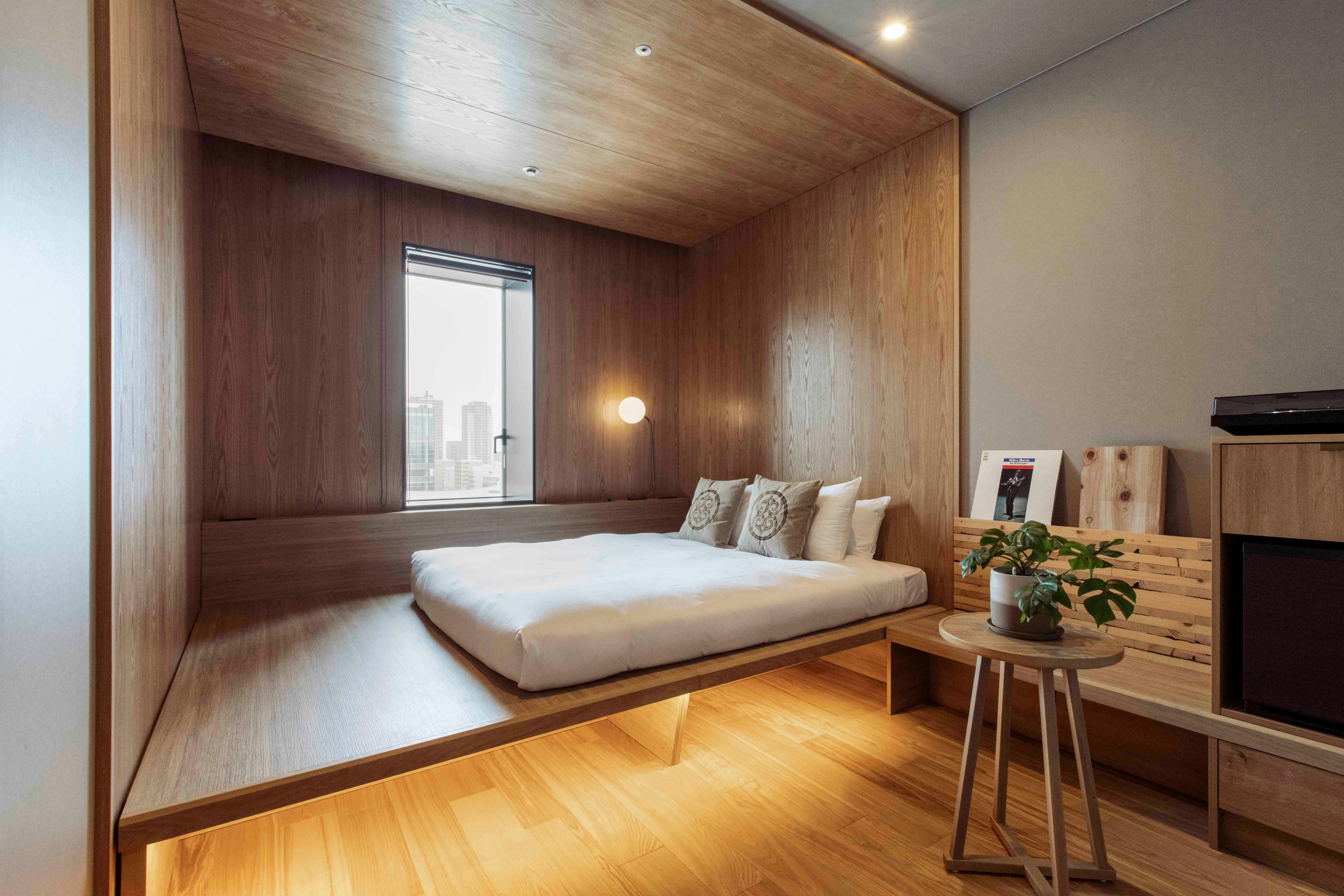 余計な意匠をそぎ落として、木質感をたっぷり感じる客室で、ベッド空間は木に囲まれておりまるでキャビンのよう。