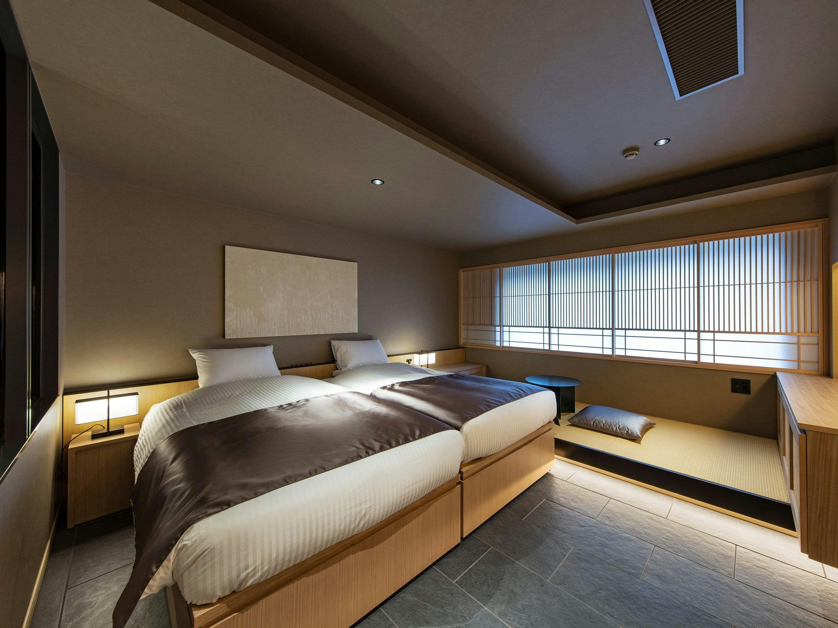 【客室情報】・28.5平米・シモンズ社製ベッド サイズ110センチ×2台 ※3名以上からは和布団 サイズ960センチを追加・シャワーブース(バスタブなし)・トイレ独立・高速インターネットWi-Fi無料【客室備品】・オリジナルナイトウェア(セパレートタイプ)・マイナスイオンドライヤー・冷蔵庫・加湿機能付空気清浄機・43型液晶テレビ・シャンプー・コンディショナー・ボディソープ・電気ケトル・マルチ携帯充電器・消臭スプレー