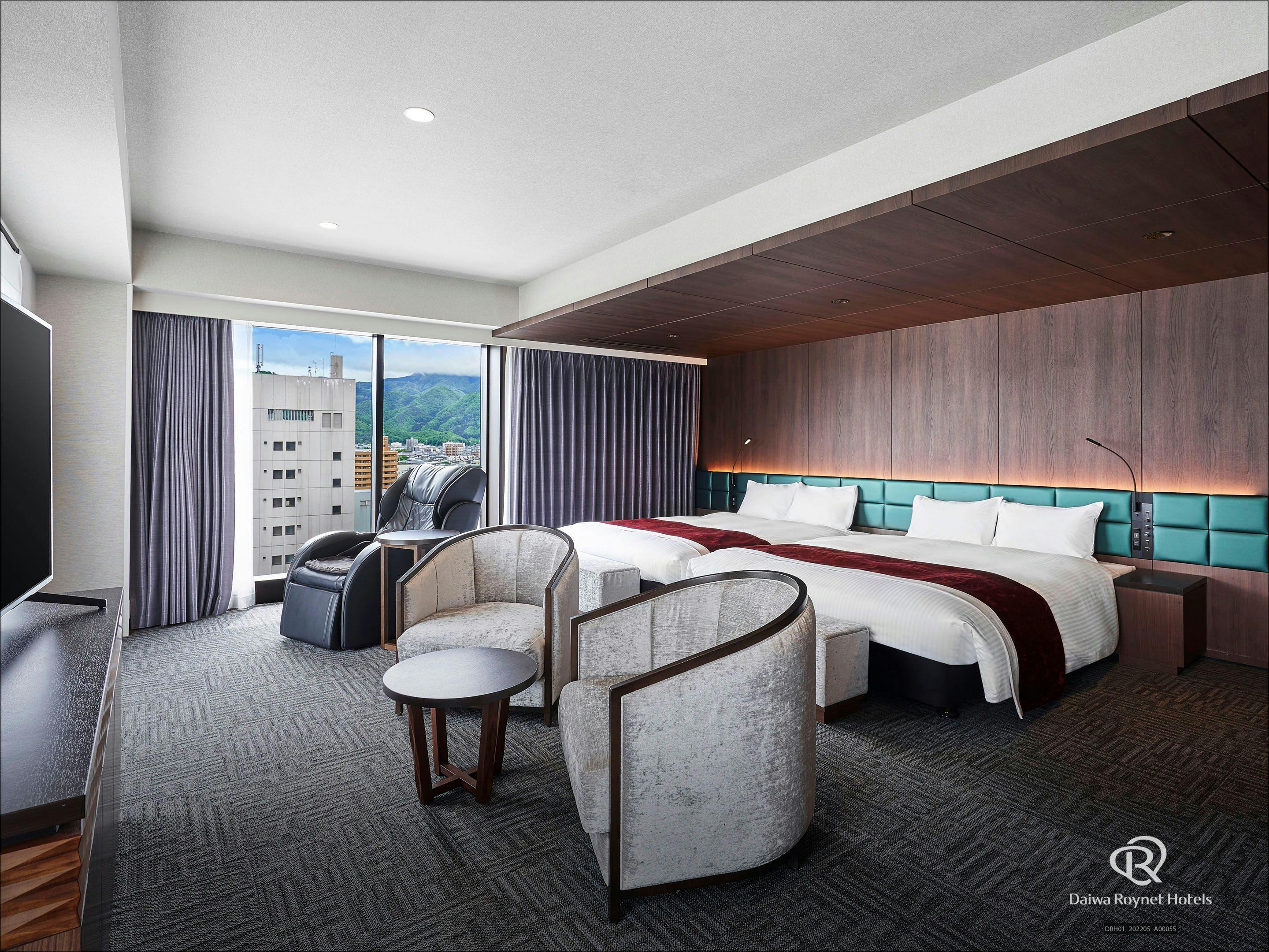 12階のお部屋。風呂・トイレ別。ベッド幅154cm×2台。加湿空気清浄機付き。マッサージチェアを設置しております。アプリ対応55型スマートTVをご用意しております。各種サブスクリプションサービスもお楽しみいただけます。※お客様ご自身のアカウントが必要となります。
