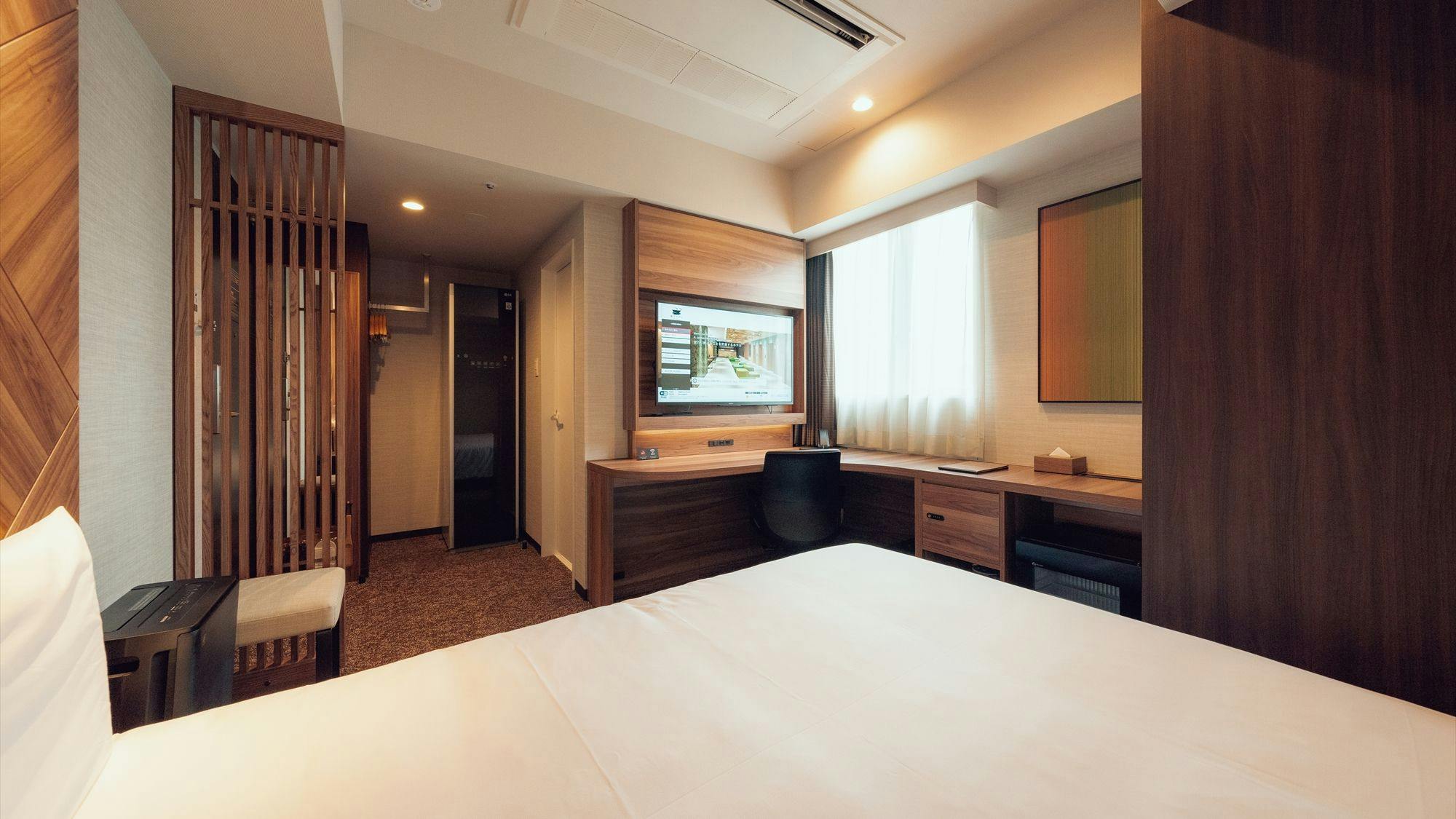 L字型の広々デスクと背もたれがある椅子でデスクワークに最適ベッドサイズ:幅160cm×長さ195cm/ユニットバス/全館Wi-Fi無料完備/コンセント完備(ベッドごとに設置)/LGスタイラー完備