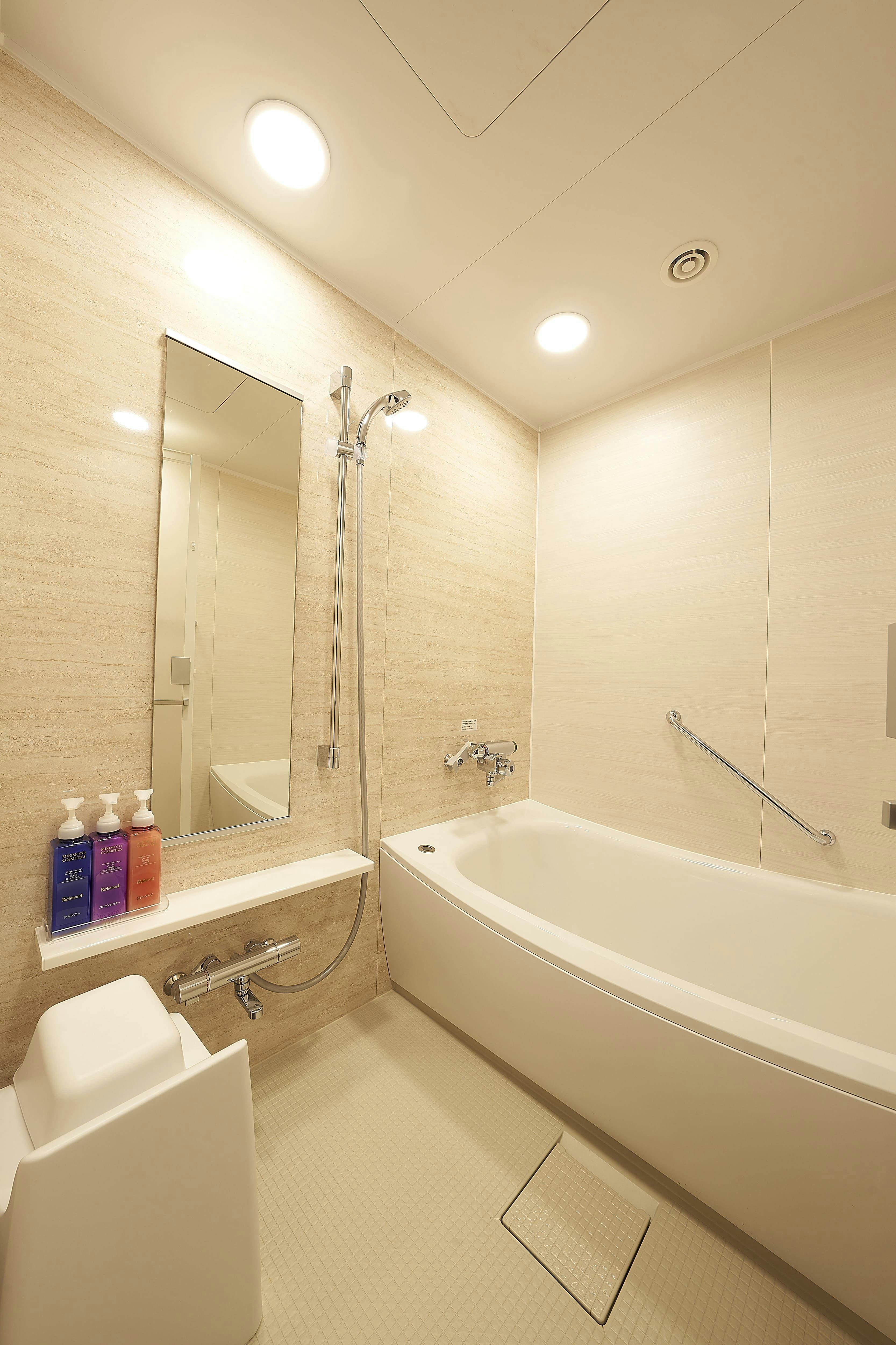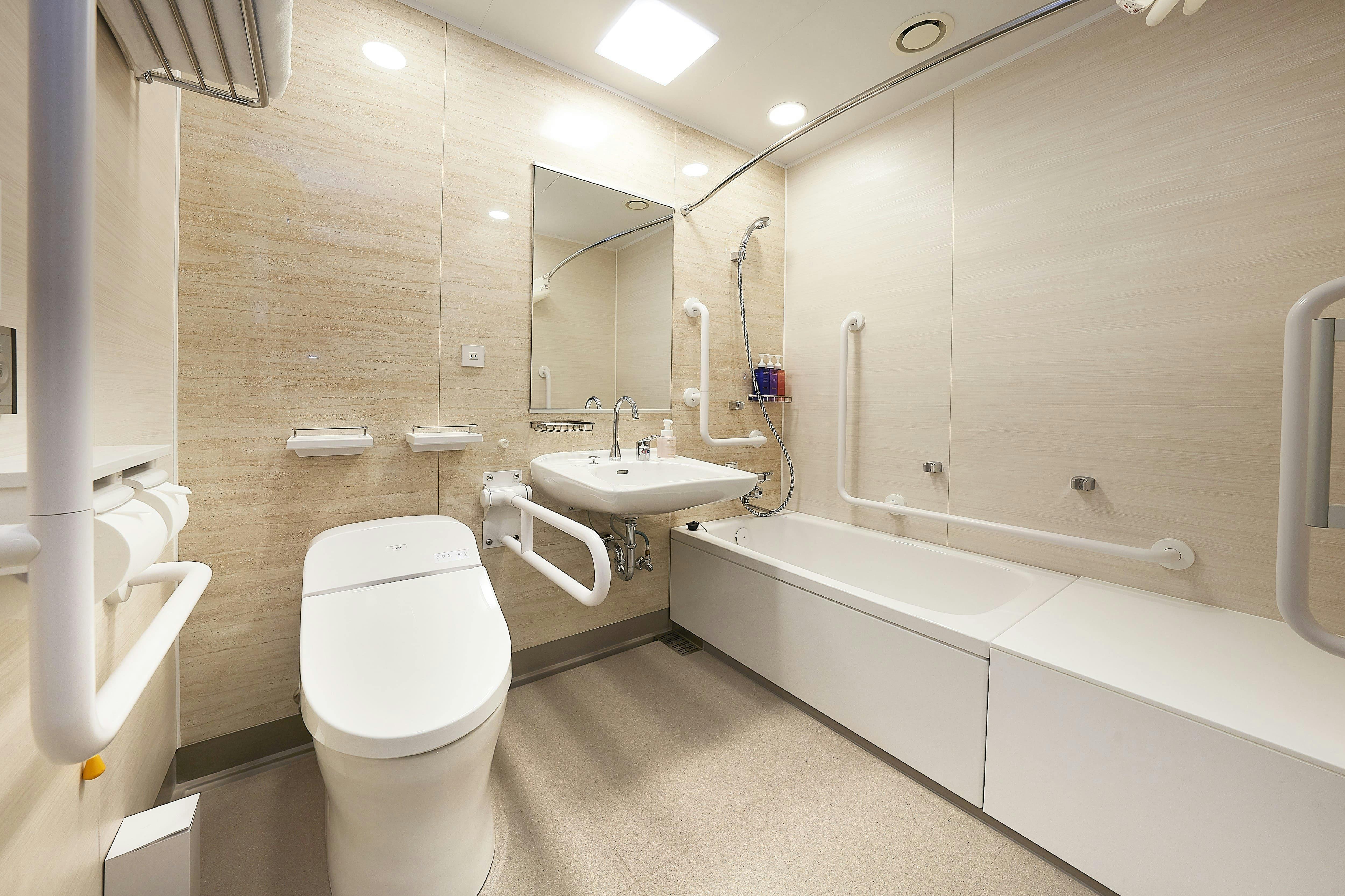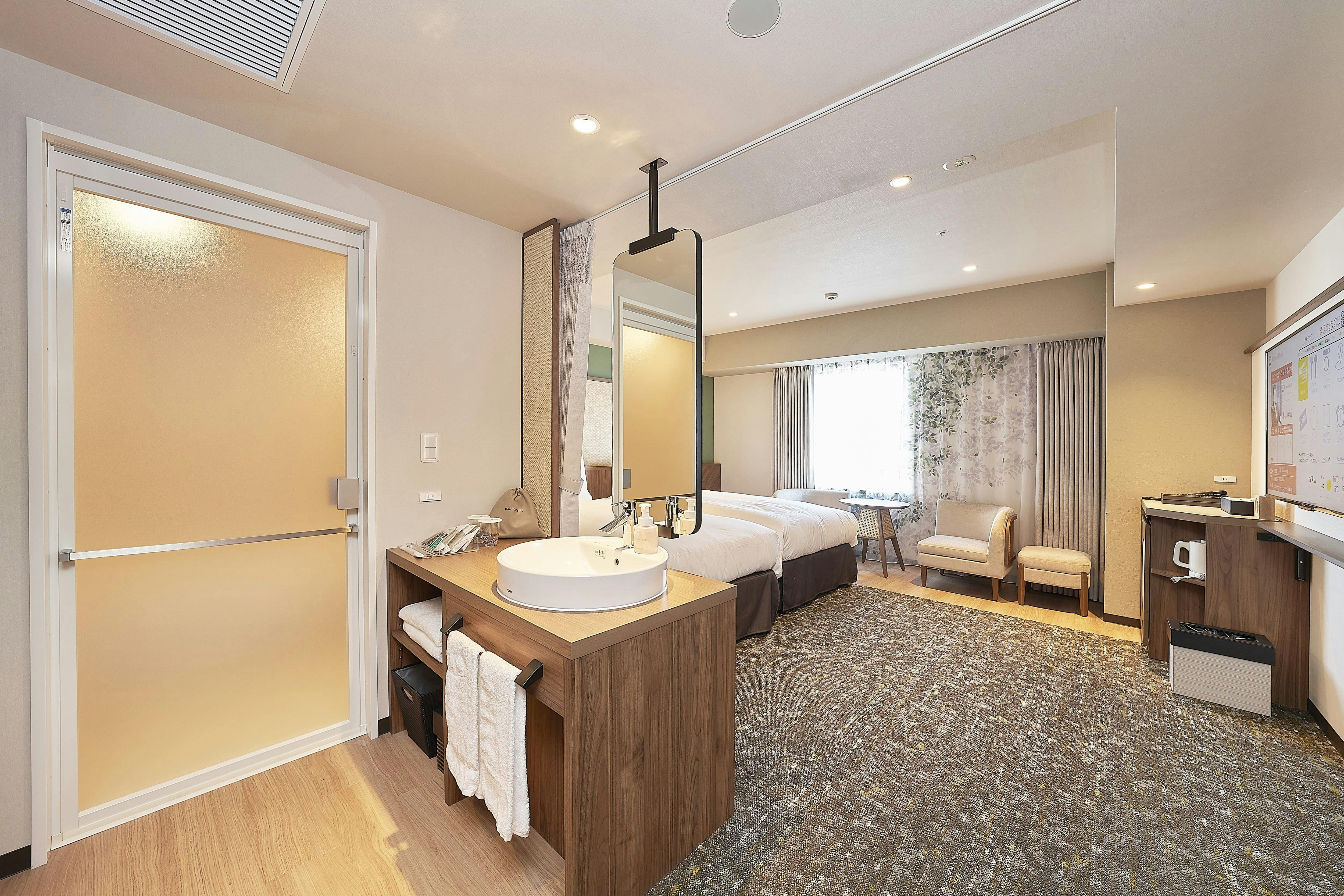 ゆったりとした26平米のお部屋に110cm幅のベッド2台のお部屋です。バリアフリー設計で、車いす利用やご高齢のお客様も安全で快適にお過ごしいただけます。