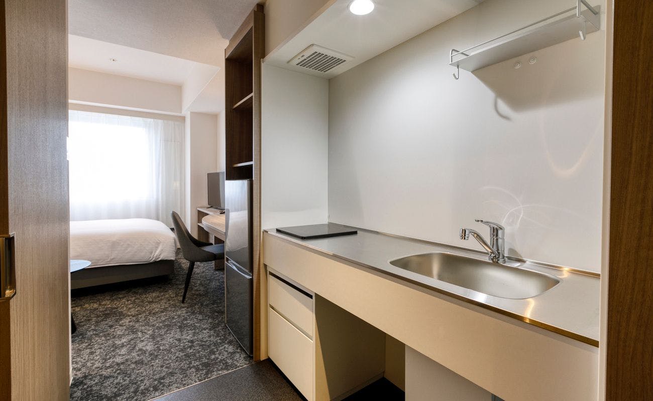 定員は1~2名様。バス・トイレ別。バスルームはシャワーブースのみ。長期でのご利用にも対応できるようキッチン付きです。キッチン用品のご紹介 ※刃物の取り扱いはございません。・鍋(小) ・フライパン(小) ・カラトリー類・箸・お茶碗、皿・フライ返し、お玉