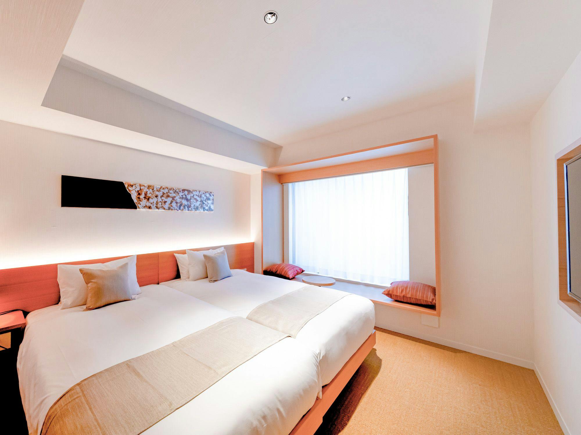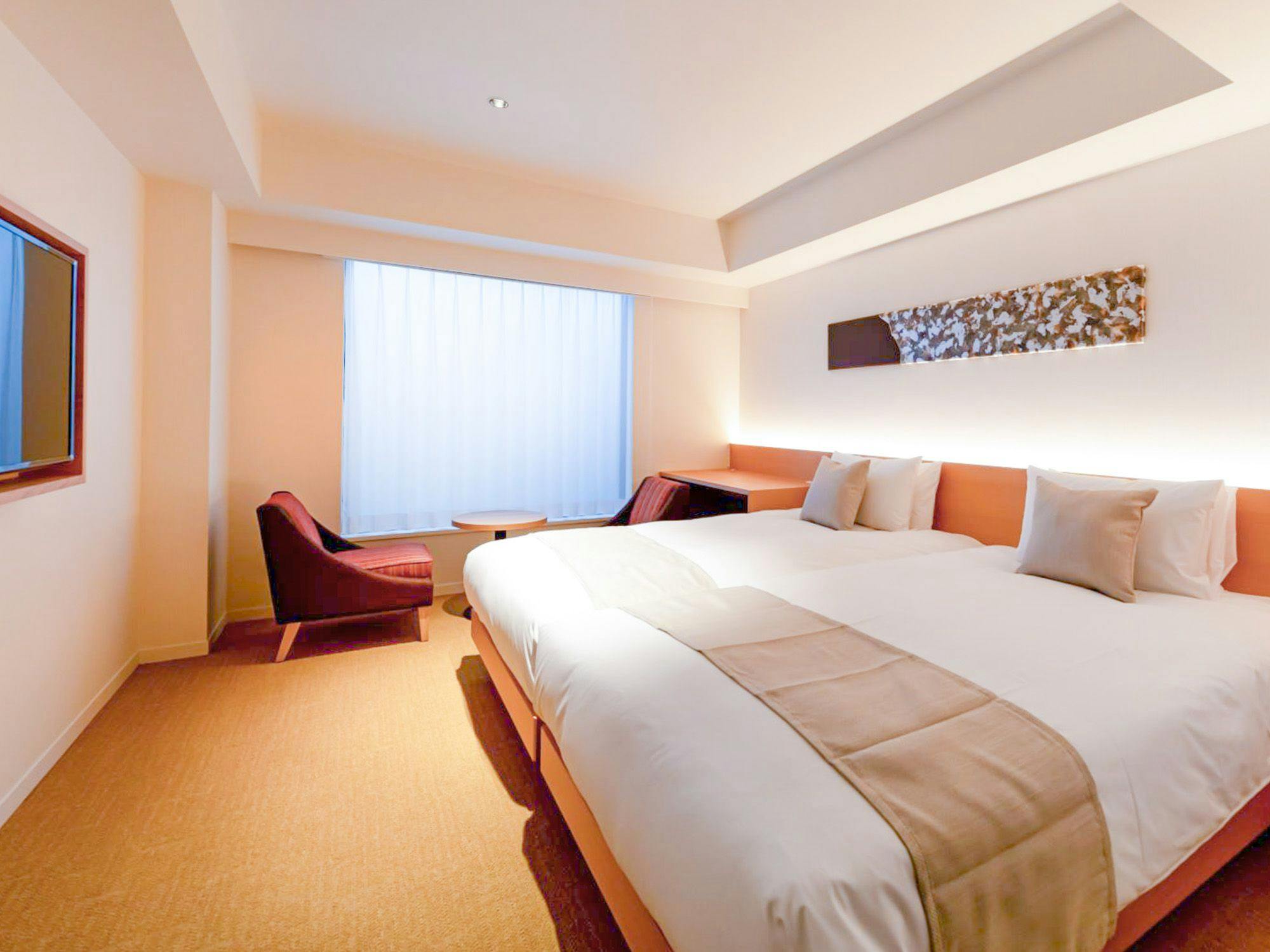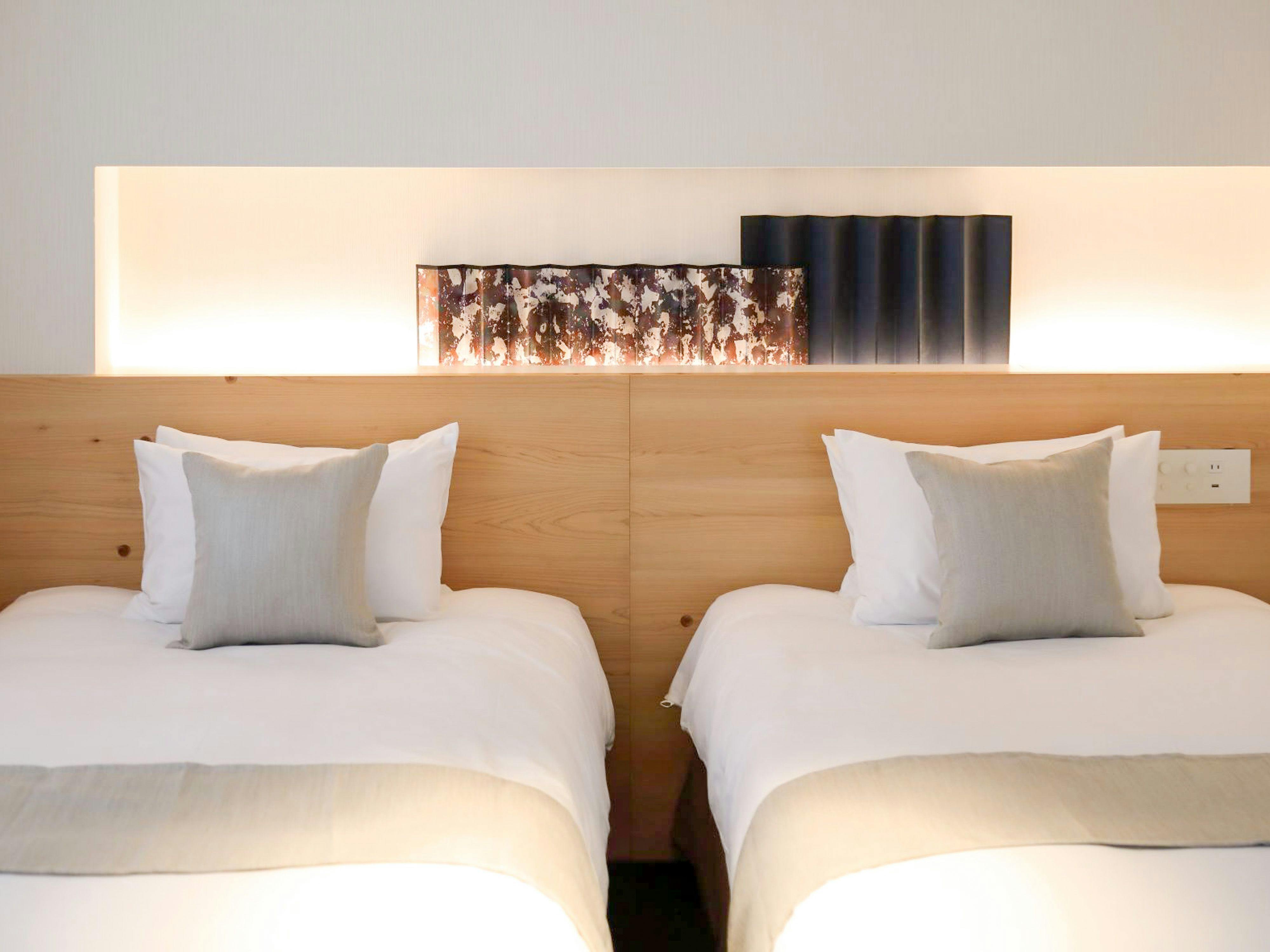 2名様のステイにぴったりなお部屋。品質の高いツインベッドで上質な眠りを実現します。くつろげる空間を大切にした、穏やかな色合いの客室。やさしく体を緩めるレインシャワーを配した、ゆったり広めの24平米のお部屋です。