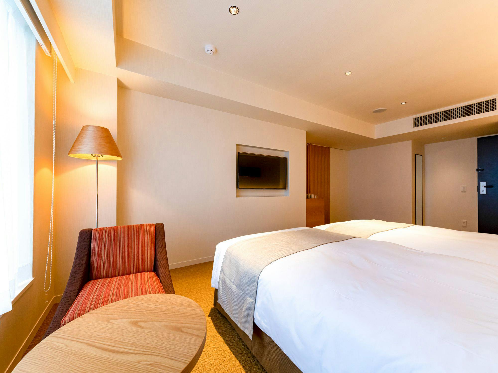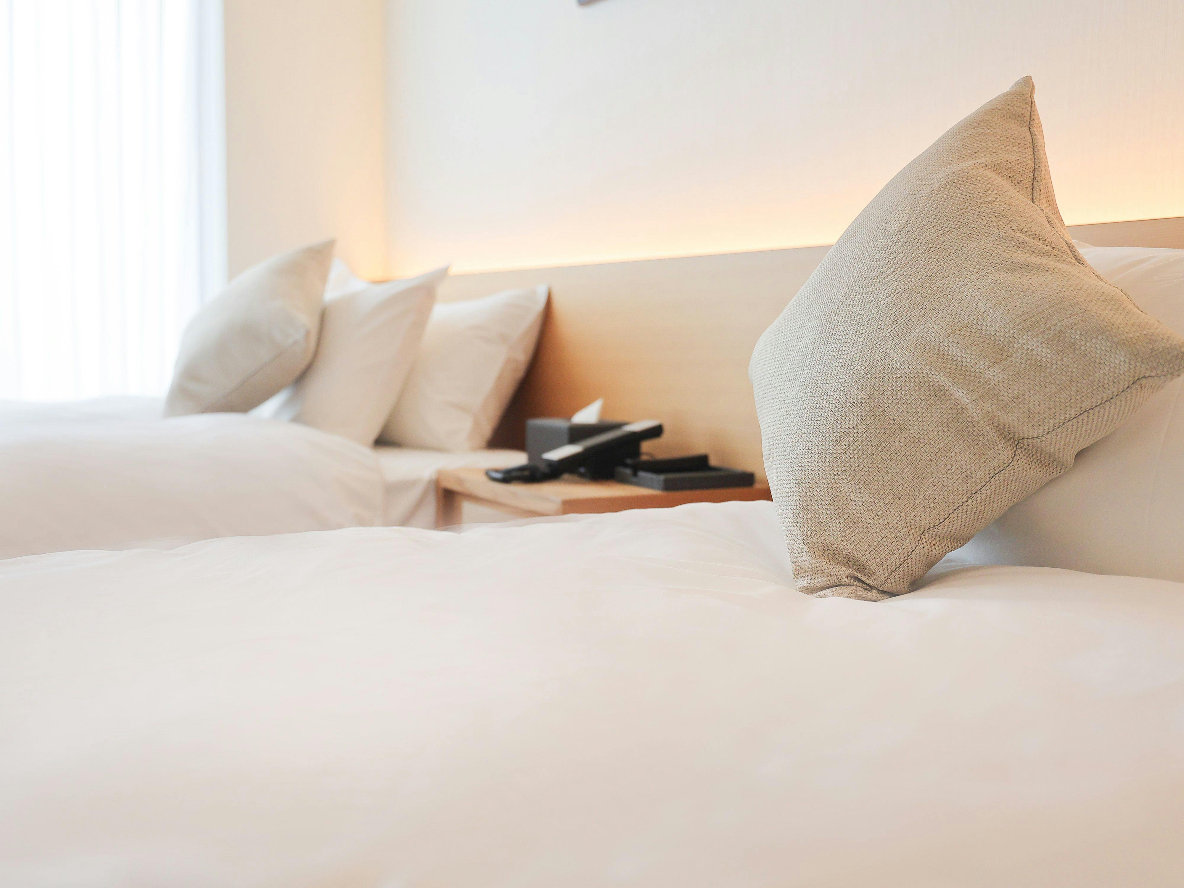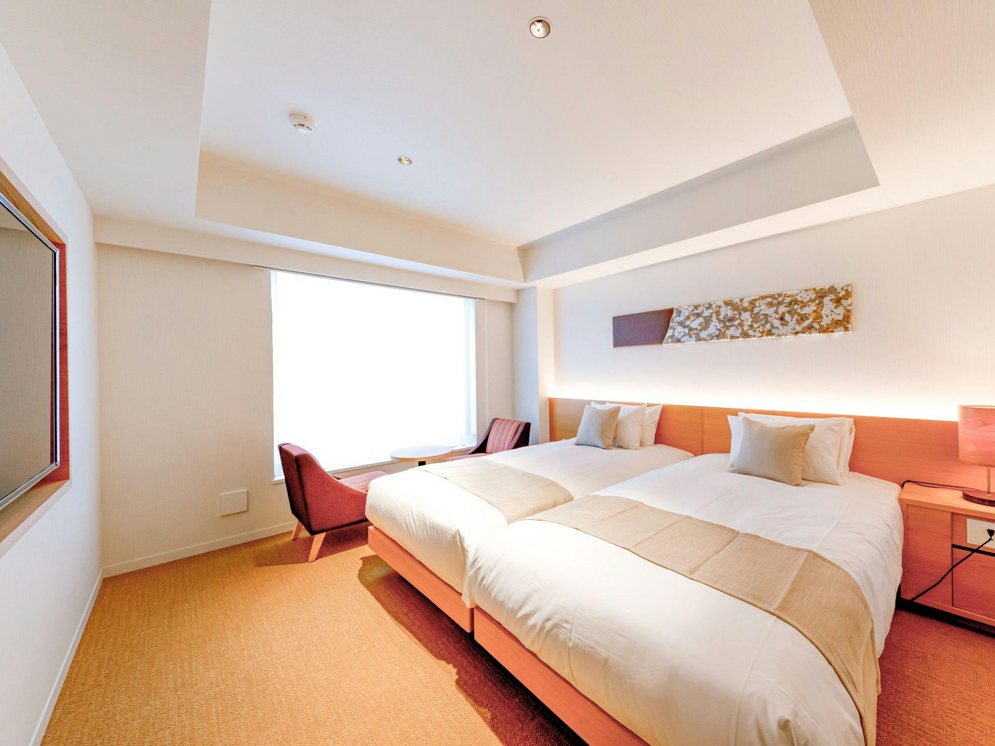 2名様のステイにぴったりなお部屋。品質の高いツインベッドで上質な眠りを実現します。くつろげる空間を大切にした、穏やかな色合いの客室。やさしく体を緩めるレインシャワーを配した、ゆったり広めの24平米のお部屋です。