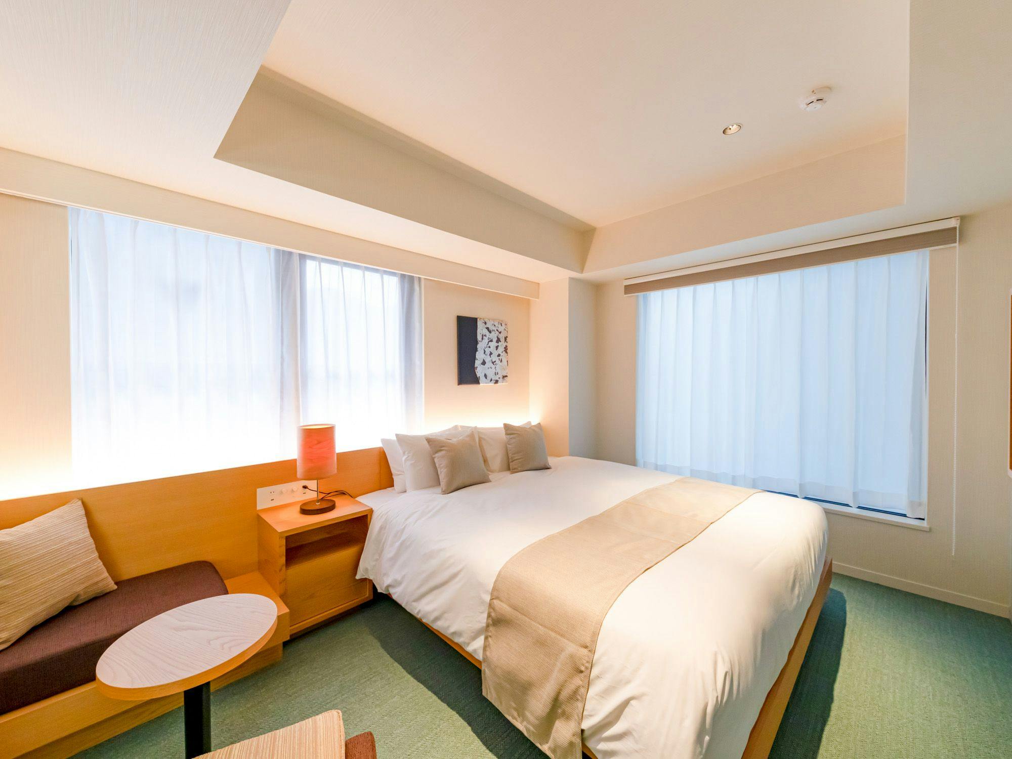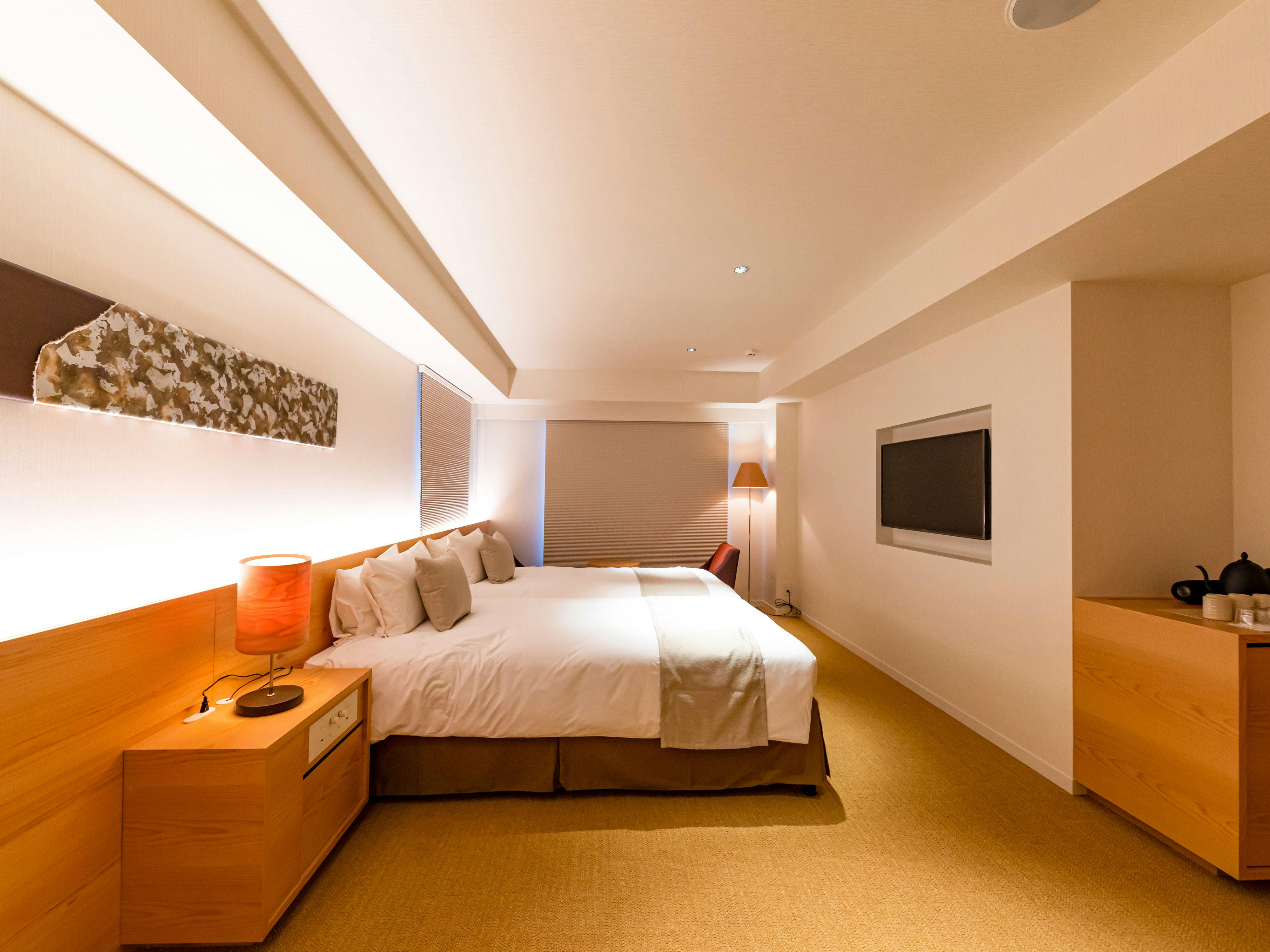 ご夫婦でのご利用はもちろん、1名でもご利用いただけるスタンダードダブル。シンプルだけどスタイリッシュ、落ち着きのある空間。ゆったりと眠れるダブルサイズのベッドとオシャレなレインシャワーを設置した、広々とした20.9平米のお部屋です。