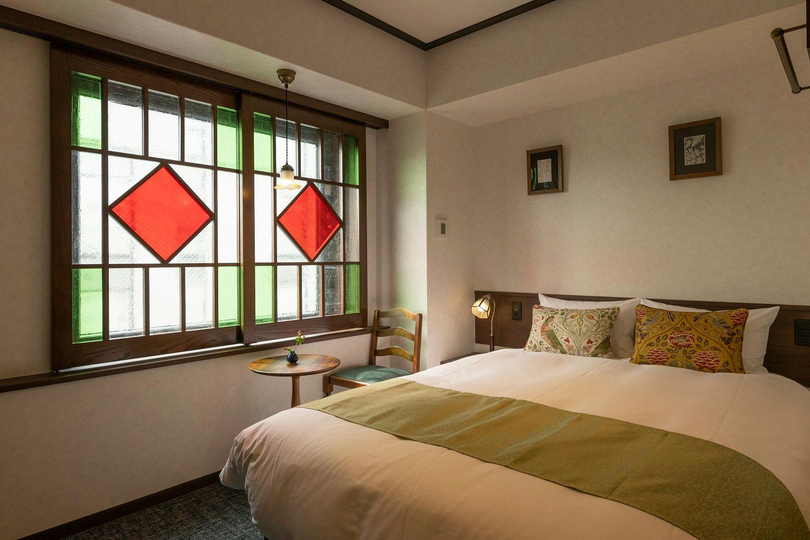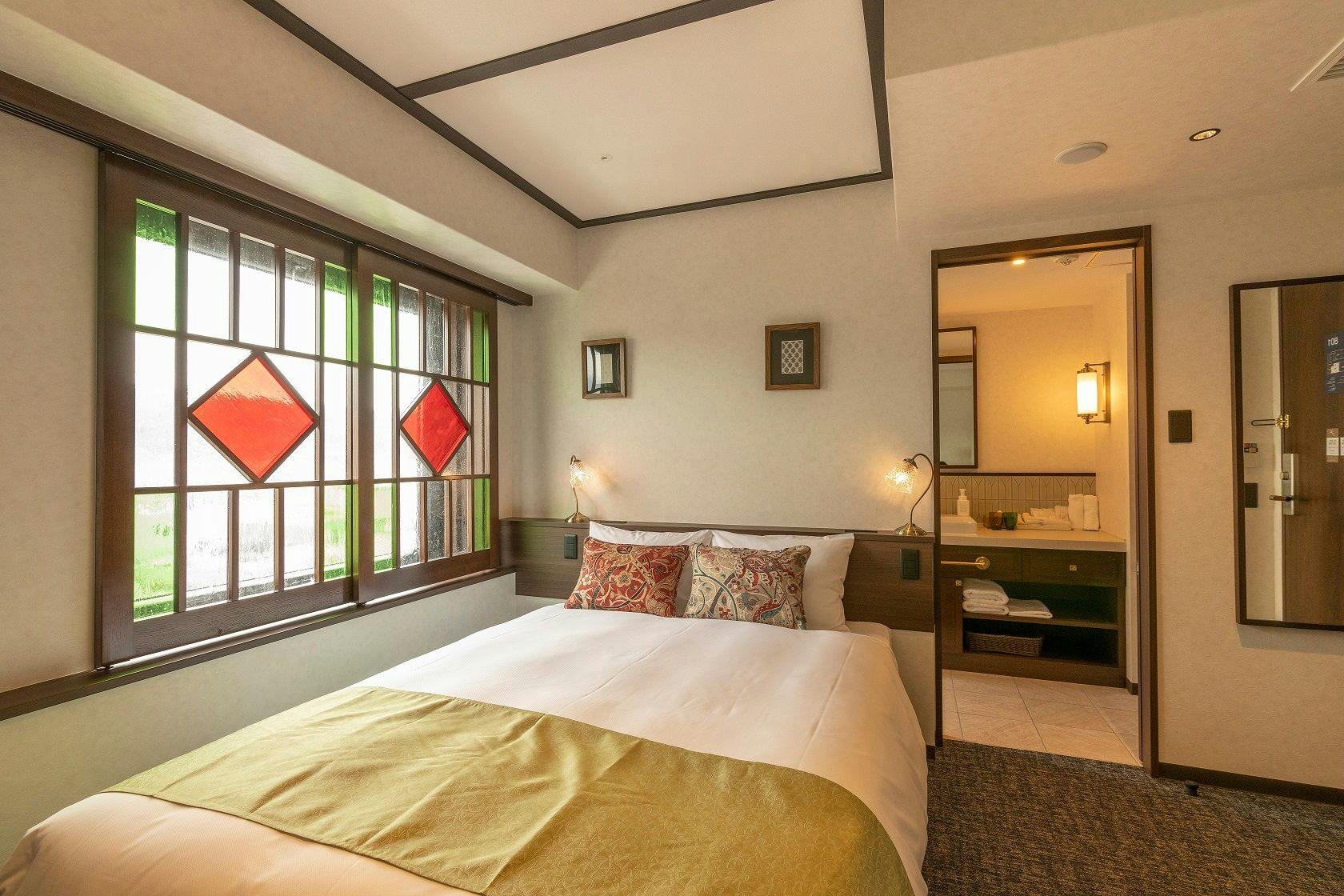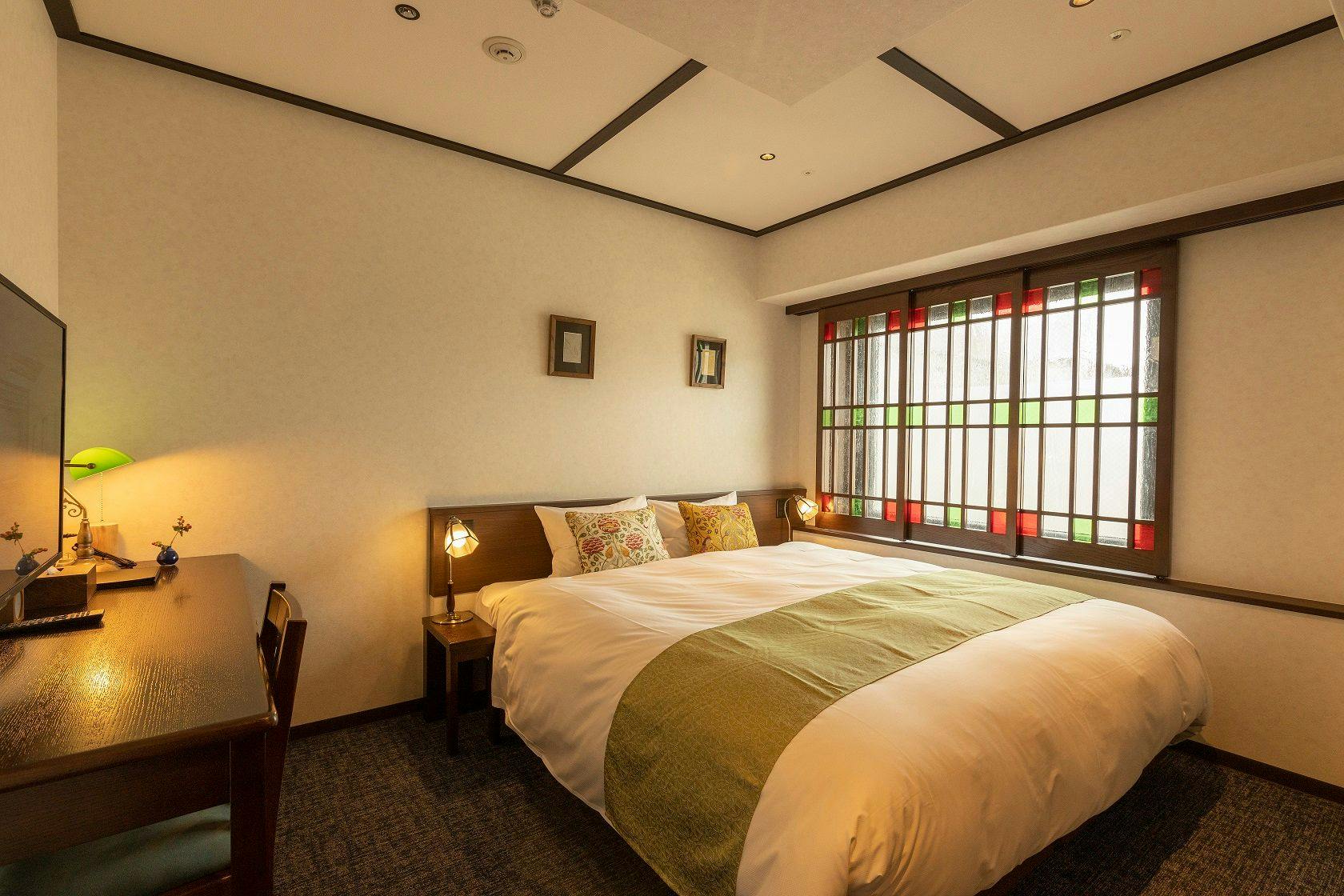 大正ロマンをテーマに、色使いや質感にこだわったレトロモダンな客室です。個室トイレ/洗い場付きのバスルーム(一部部屋を除く)で、ゆったりとリフレッシュいただけます。幅140cmのシモンズ社製のダブルベッドで、ゆっくりお休みいただけます。6階以上のお部屋を確約。クリアガラスの窓で客室、浴室からの眺望をお楽しみいただけます。
