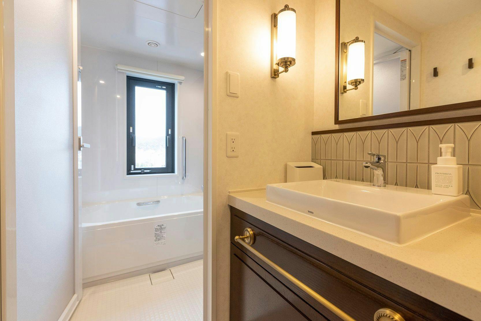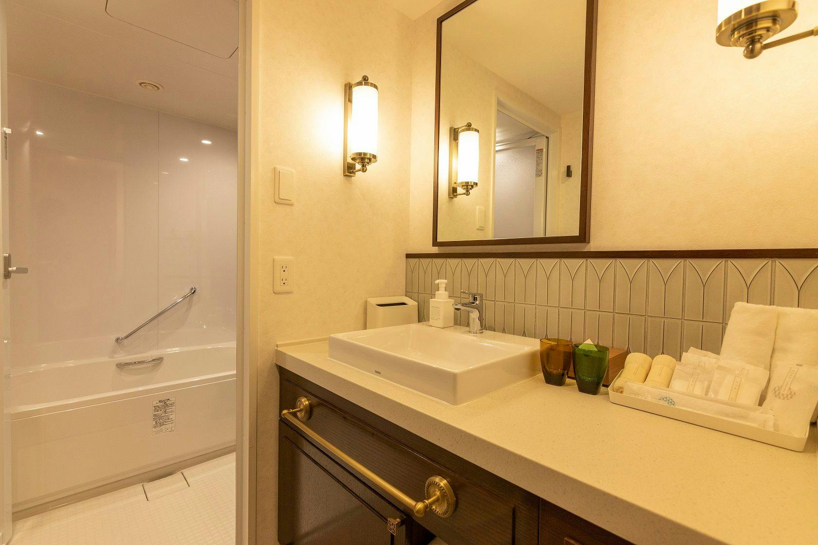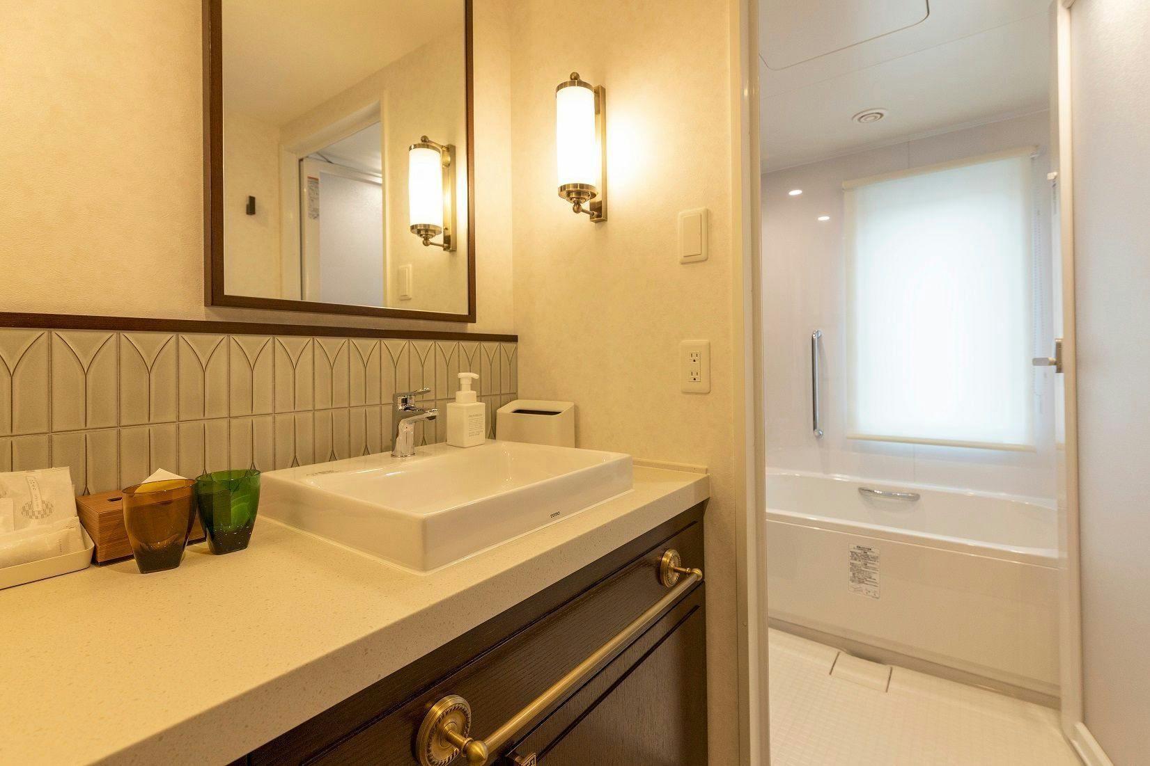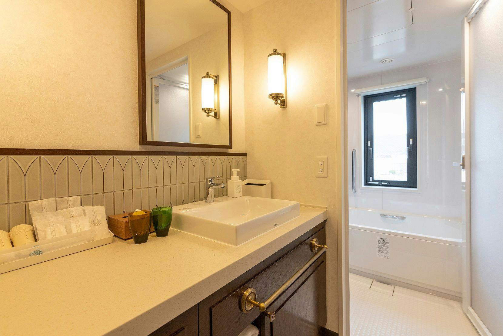 大正ロマンをテーマに、色使いや質感にこだわったレトロモダンな客室です。個室トイレ/洗い場付きのバスルームでゆったりリフレッシュいただけます。幅110cmのシモンズ社製のツインベッドで、快適にお過ごしいただけます。6階以上のお部屋を確約。クリアガラスの窓で客室、浴室からの眺望をお楽しみいただけます。