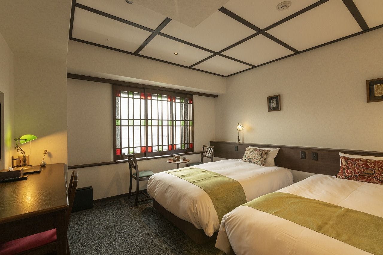 大正ロマンをテーマに、色使いや質感にこだわったレトロモダンな客室です。個室トイレ/洗い場付きのバスルームでゆったりリフレッシュいただけます。幅110cmのシモンズ社製のツインベッドで、快適にお過ごしいただけます。