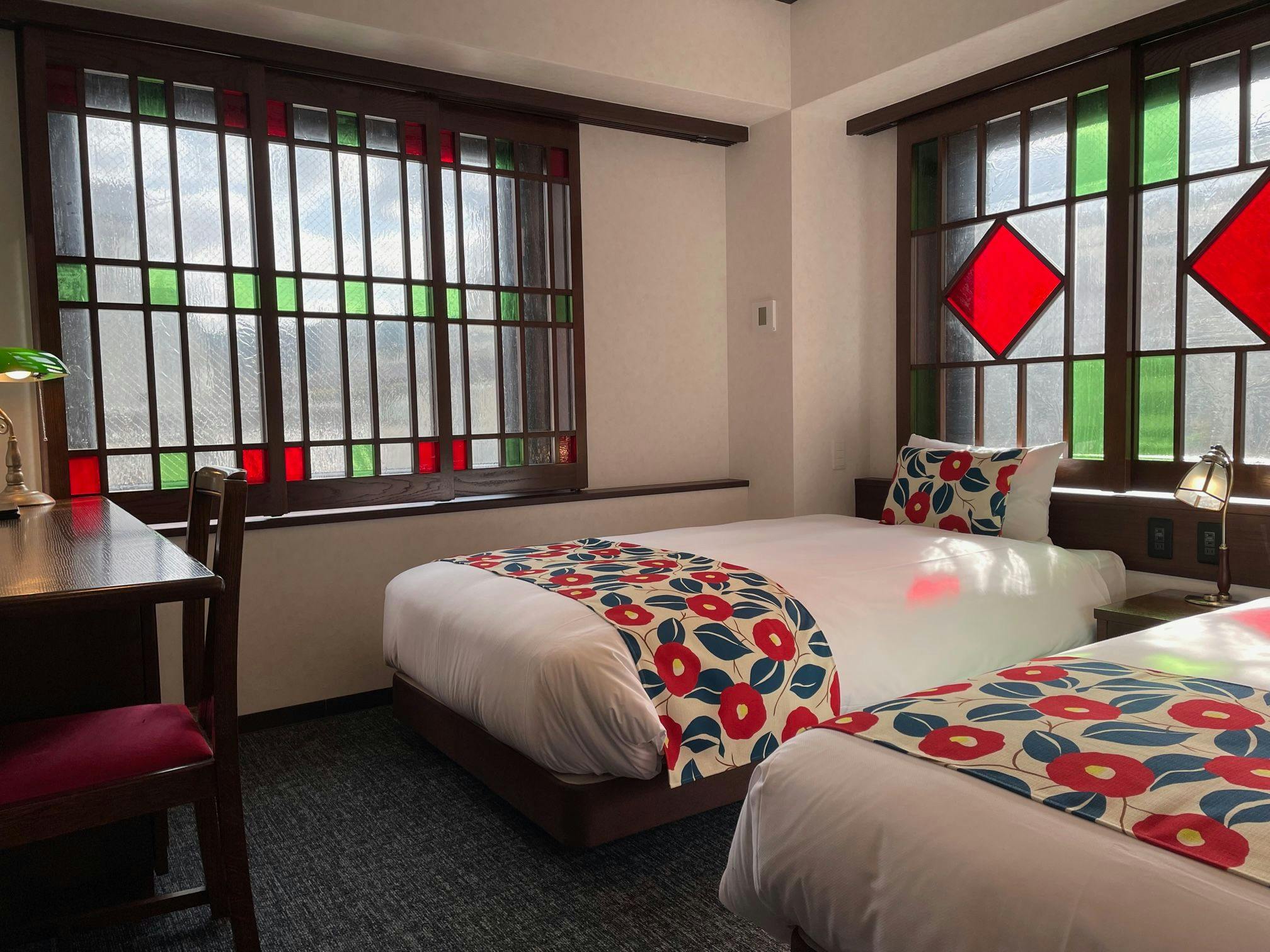 大正ロマンをテーマに、色使いや質感にこだわったレトロモダンな客室です。角部屋で窓が2面設けられた開放的でゆったりとした居室スペースと、個室トイレ/洗い場付きのバスルームでゆっくりお寛ぎいただけます。幅110cmのシモンズ社製のツインベッドで快適にお過ごしいただけます。