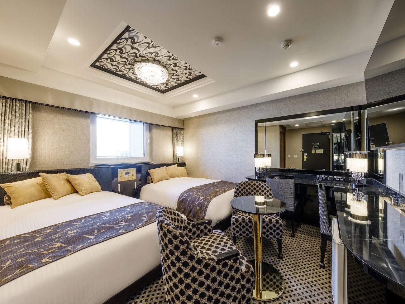 ■広さ15平米 / ベッド幅100cm×2台□定員:1~2名□ベッド下収納有□Wi-Fi接続無料□50型液晶テレビ□枕元コンセント・USBポート・HDMI端子□ナノイーX機能付空調□暖房機能付温水洗浄便座