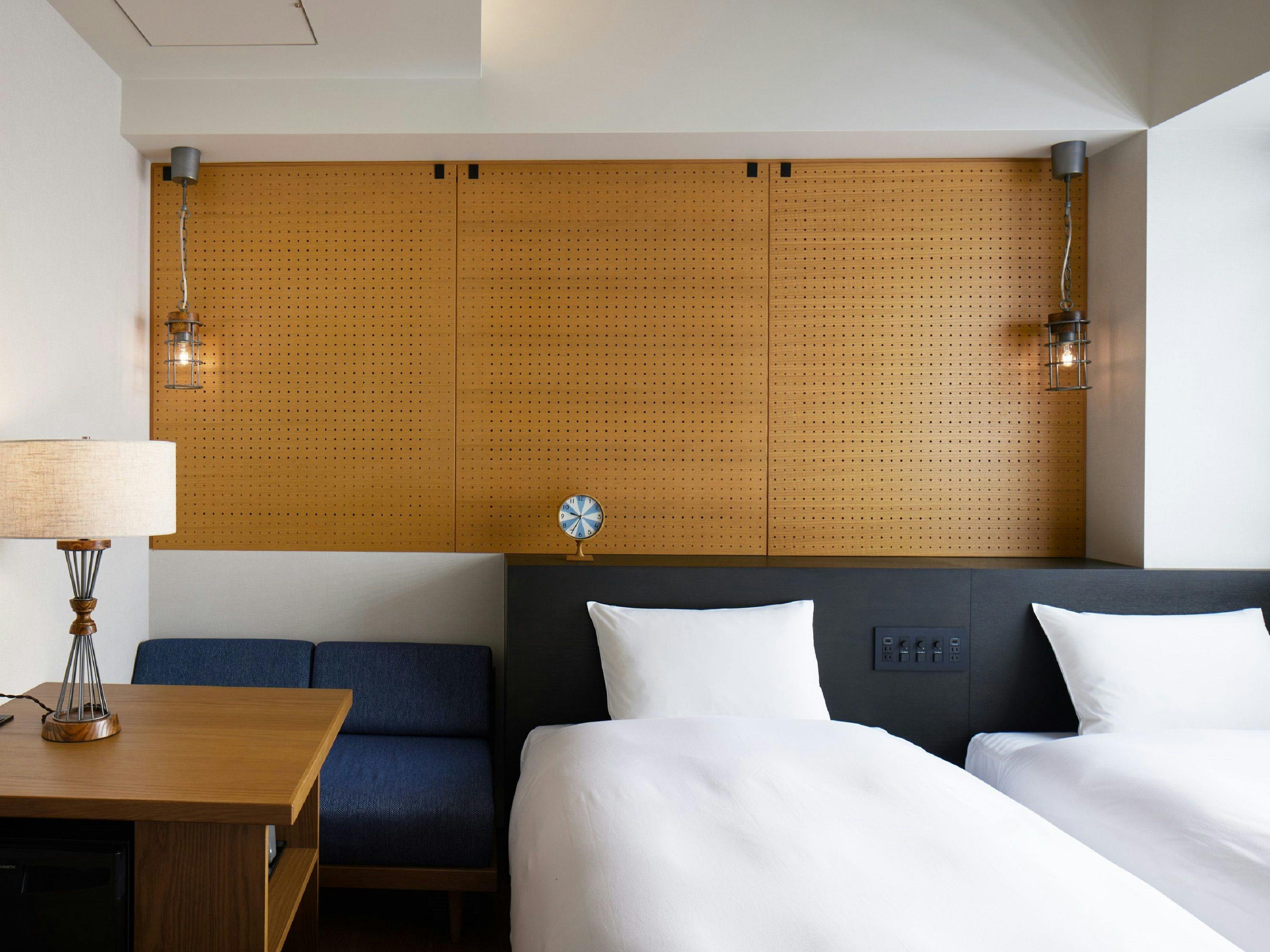 17平米の客室に1,400mmのダブルベッドの上に1,000mmのロフトベッドを備え、最大3名様までご宿泊可能で、ファミリーやグループにもおすすめです。洗い場付のバスルームと独立したトイレを配置し、3名様でもストレスなくご利用いただける機能的な客室です。歯ブラシが客室に常設からレセプション提供に変わります。