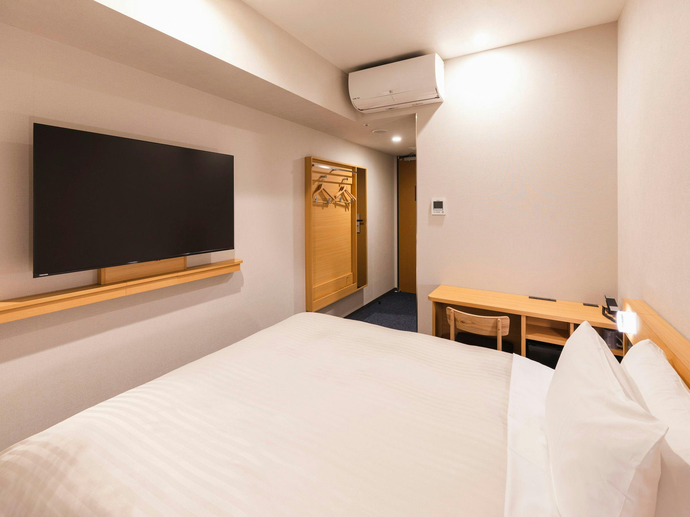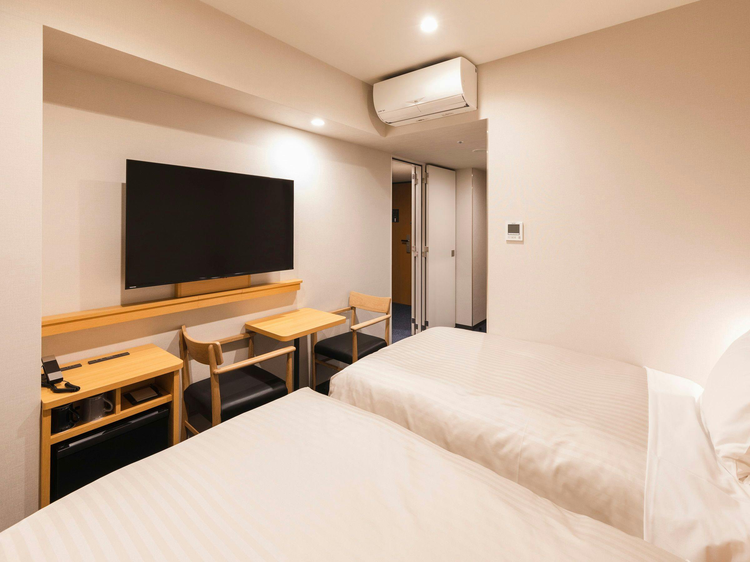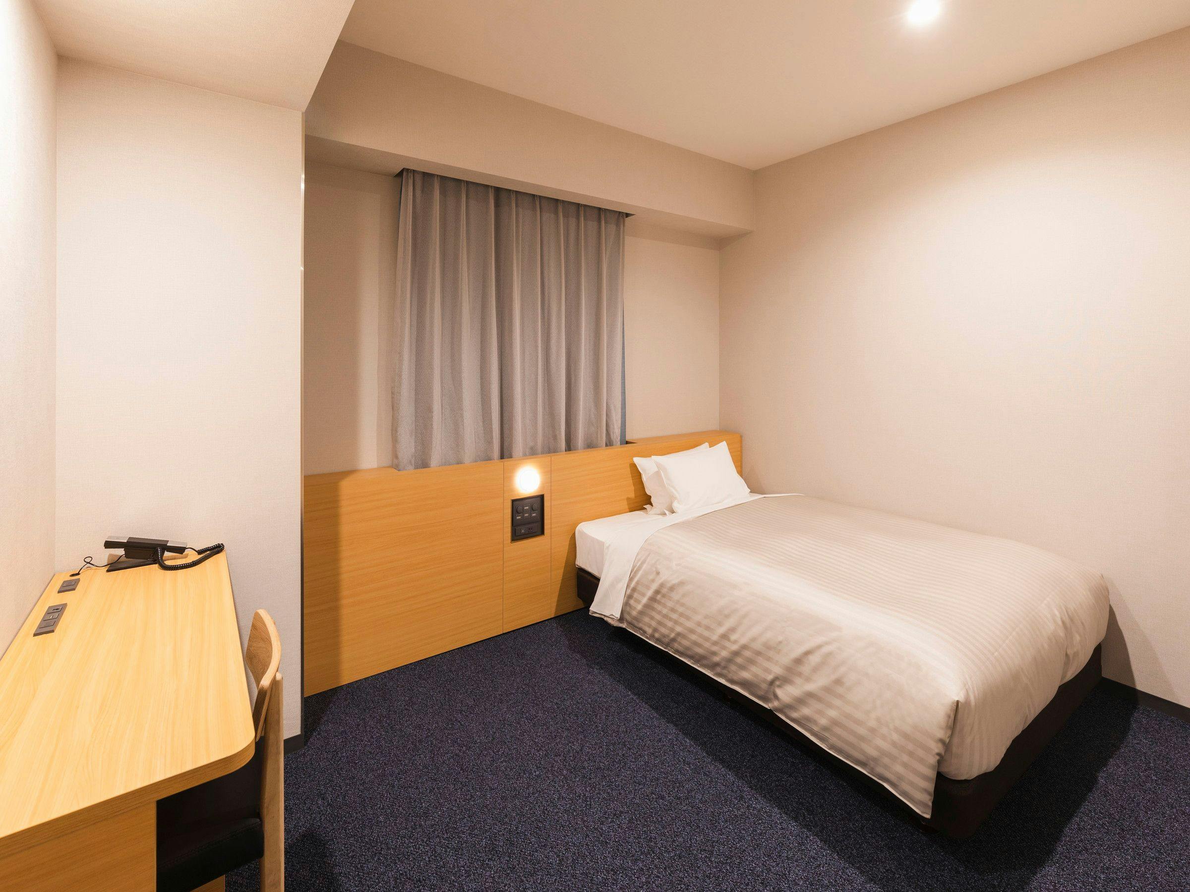 木目を活かしたシンプルな家具と淡いグレーのカーテンやベッドカバーとの色合いが落ち着いた雰囲気のある客室です。コンパクトな造りですが、ベッド下にスーツケース等を収納できるため、限られたスペースを有効活用していただけます。ベッドのすぐ横に、コンセントとUSBポートがありますので、スマートフォン等の充電に便利です。