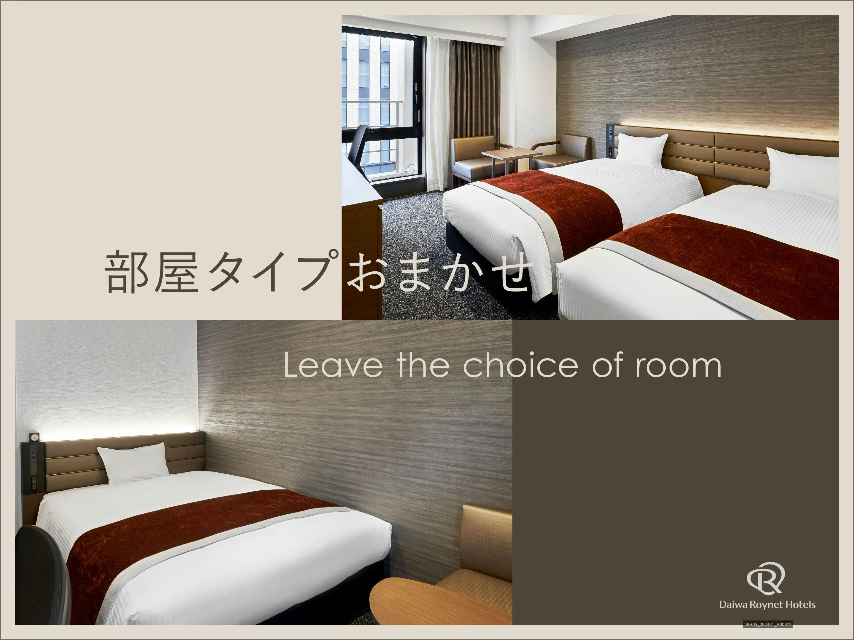 禁煙部屋にてホテルにおまかせ(セパレート式・バスルーム)ダブル及びツインのお部屋でのご案内となります。