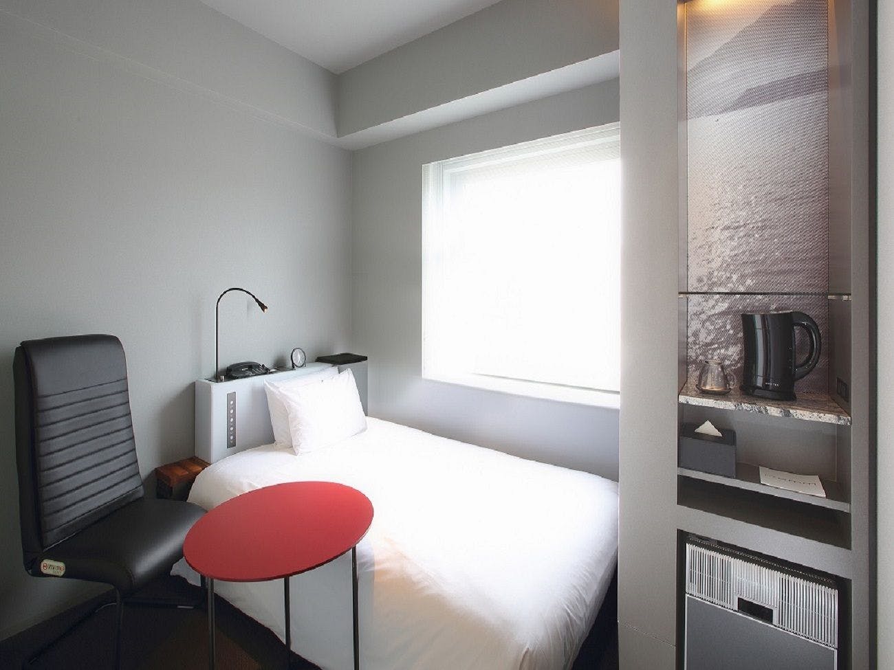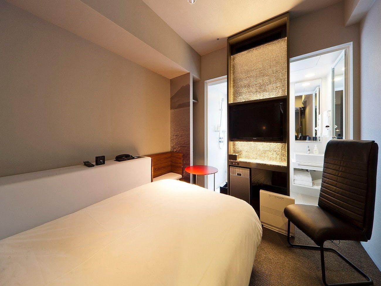 寝室とシャワーブースを仕切るガラスパーティションがコンパクトな空間の中に広がりを感じさせるデザイン■広さ:13.8平米■ベッド幅120cm×長さ195cm×1台■シャワーブースあり・バスタブなし■マッサージチェア・レインシャワー完備■インターネット接続無料(Wi-Fi・LAN接続)■ミネラルウォーターお1人様1本ずつご用意■32インチ液晶テレビ