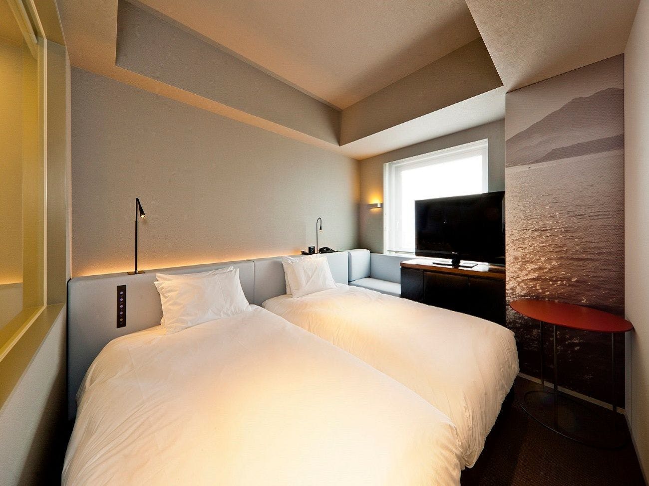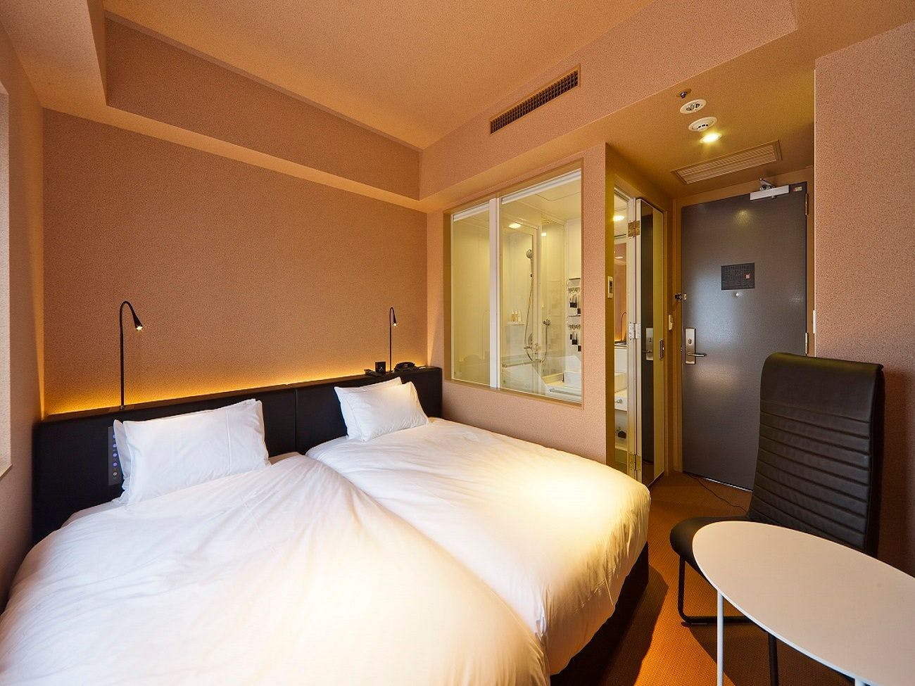 寝室とシャワーブースを仕切るガラスパーティションがコンパクトな空間の中に広がりを感じさせるデザイン■広さ:18.4平米■ベッド幅110cm×長さ200cm×2台■シャワーブースあり・バスタブなし■マッサージチェア・レインシャワー完備■インターネット接続無料(Wi-Fi・LAN接続)■ミネラルウォーターお1人様1本ずつご用意■42インチ液晶テレビ