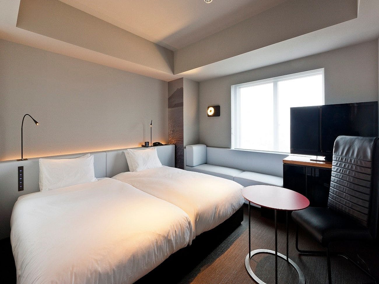 寝室とバスルームを仕切るガラスパーティションがコンパクトな空間の中に広がりを感じさせるデザイン■広さ:22.1平米■ベッド幅100cm×長さ195cm×2台■バスタブあり■マッサージチェア・レインシャワー完備■インターネット接続無料(Wi-Fi・LAN接続)■ミネラルウォーターお1人様1本ずつご用意■42インチ液晶テレビ
