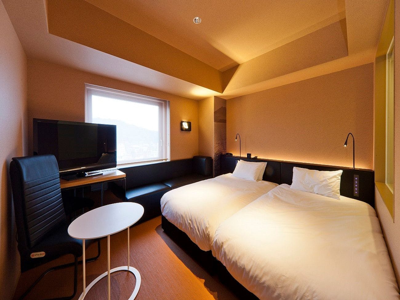 寝室とバスルームを仕切るガラスパーティションがコンパクトな空間の中に広がりを感じさせるデザイン■広さ:25平米■ベッド幅110cm×長さ200cm×2台■バスタブあり■マッサージチェア・レインシャワー完備■インターネット接続無料(Wi-Fi・LAN接続)■ミネラルウォーターお1人様1本ずつご用意■42インチ液晶テレビ