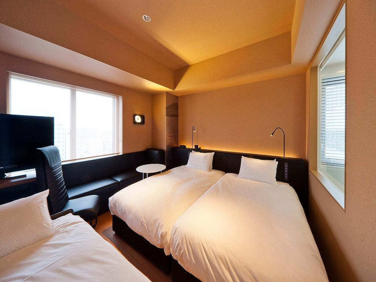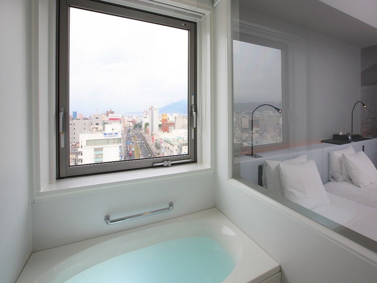 寝室とバスルームを仕切るガラスパーティションがコンパクトな空間の中に広がりを感じさせるデザイン■広さ:26.2平米■ベッド幅110cm×長さ200cm×2台/幅95cm×長さ188cm×1台(エキストラベッド)■バスタブあり■マッサージチェア・レインシャワー完備■インターネット接続無料(Wi-Fi・LAN接続)■ミネラルウォーターお1人様1本ずつご用意■42インチ液晶テレビ