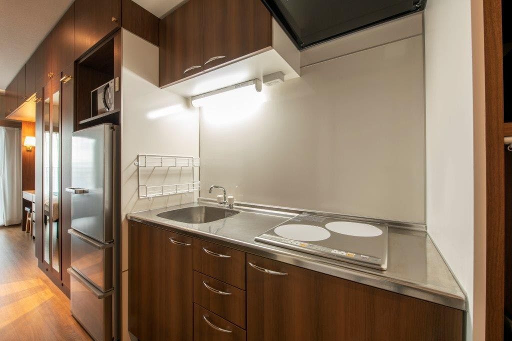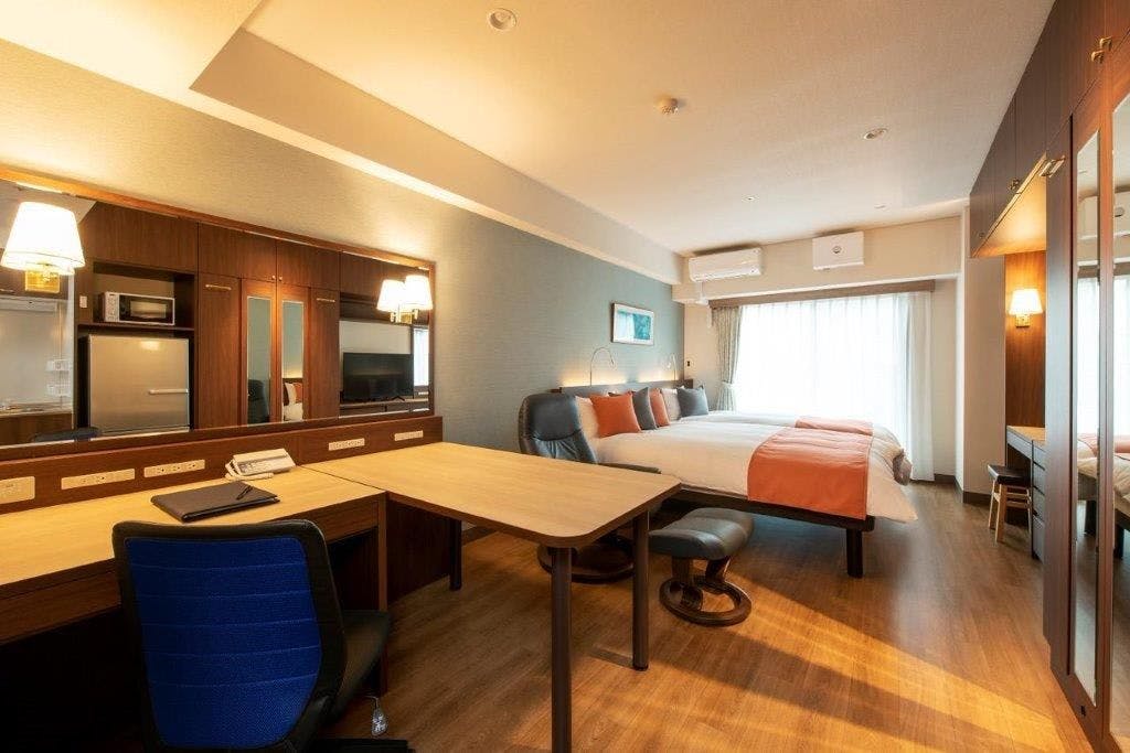 ご夫婦やカップルでのご利用におすすめのポートダブルルーム。ダブルベッド1台、キッチン、キッチン用品、洗濯機、洗濯洗剤、衣類乾燥機、温水洗浄式トイレ、バルコニー