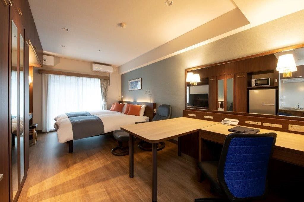 親子同士・友人同士のご旅行に便利なハリウッドツインルーム。シングルベッドを2台設置しております。シングルベッド2台、キッチン、キッチン用品、洗濯機、洗濯洗剤、衣類乾燥機、温水洗浄式トイレ、バルコニー
