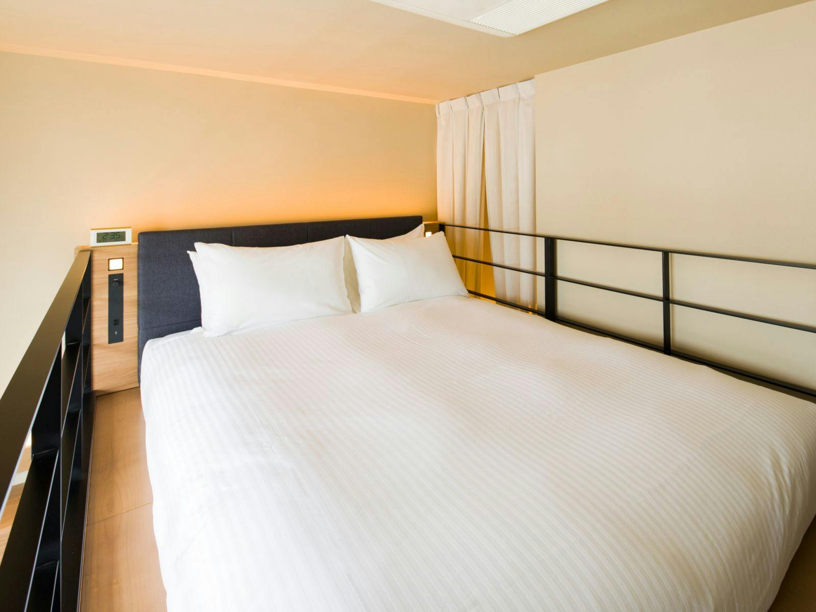 ■ 広さ 17平米■ ベッド幅 140cm×1台 ※マットレス+お布団になります。■ ユニットバス■ 全室無料Wifi■ 枕元コンセント(USBポートもあり)■ 10階■ 定員3名 ※室内に階段がある立体的なお部屋です。※常設ベッド(マットレス+お布団)は上階部(ロフト)となります。※3名利用時は1台はソファーベッド(幅 90cm)となります。※添い寝のお子様のご利用は出来かねます。