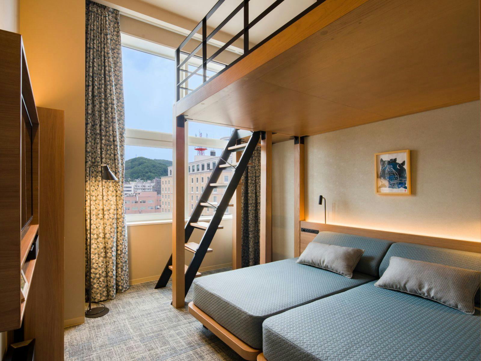 ■ 広さ 22.1平米■ ベッド幅 110cm×2台+布団(幅 140cm)■ バス・トイレ別■ 全室無料Wifi■ 枕元コンセント(USBポートもあり)■ 10階■ 定員4名 ※室内に階段がある立体的なお部屋です。※下階部にベッド2台、上階部(ロフト)にダブルサイズの布団(4名利用時)がございます。※添い寝のお子様は2名まで利用できますが、上階部のご利用はご遠慮くださいませ。