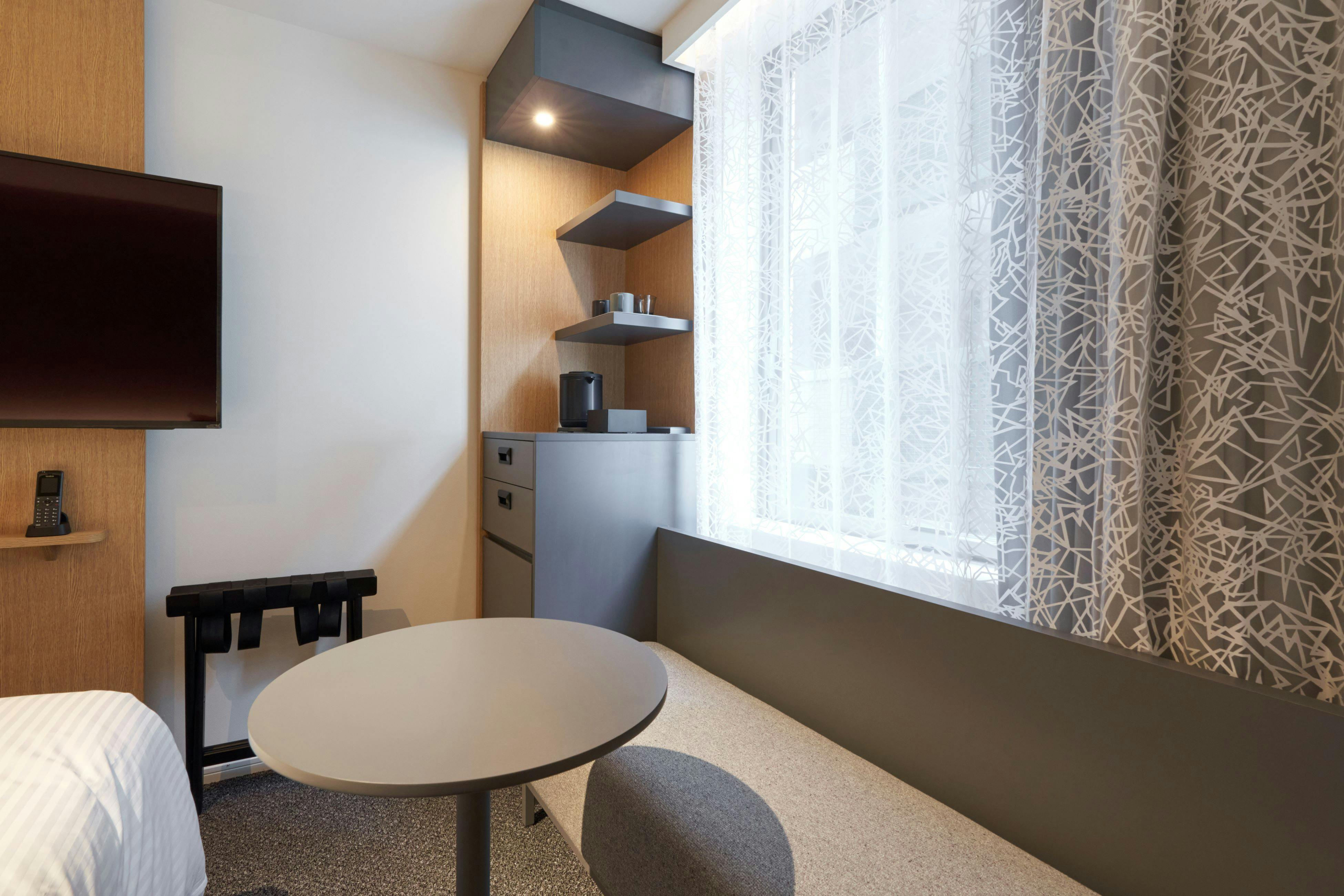 ダブルベッド(140cm幅)と長机を備えた機能的な客室となっており、