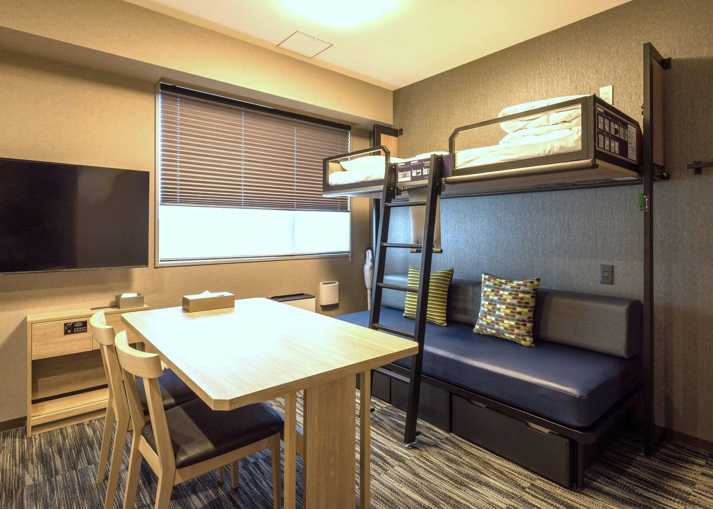 100センチ幅の正ベッド2台とソファーベッド2台をご用意しており、計4名様にてご利用可能なお部屋です。ゆったりとくつろげるソファーを備え、グループでも気兼ねなくお過ごしいただける客室。夜はソファーをベッドとしてご利用いただくことで、最大4名様までご宿泊いただけます。