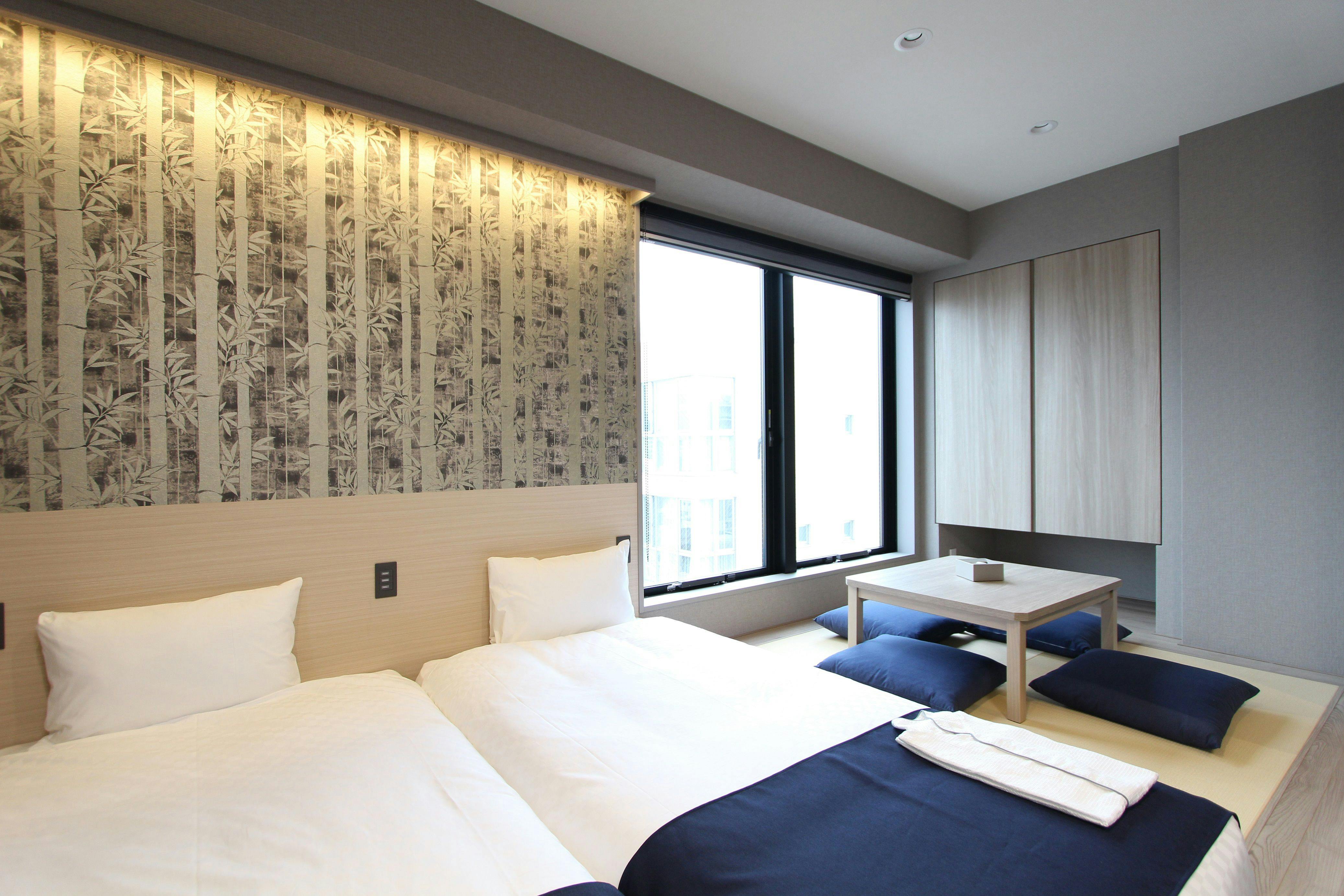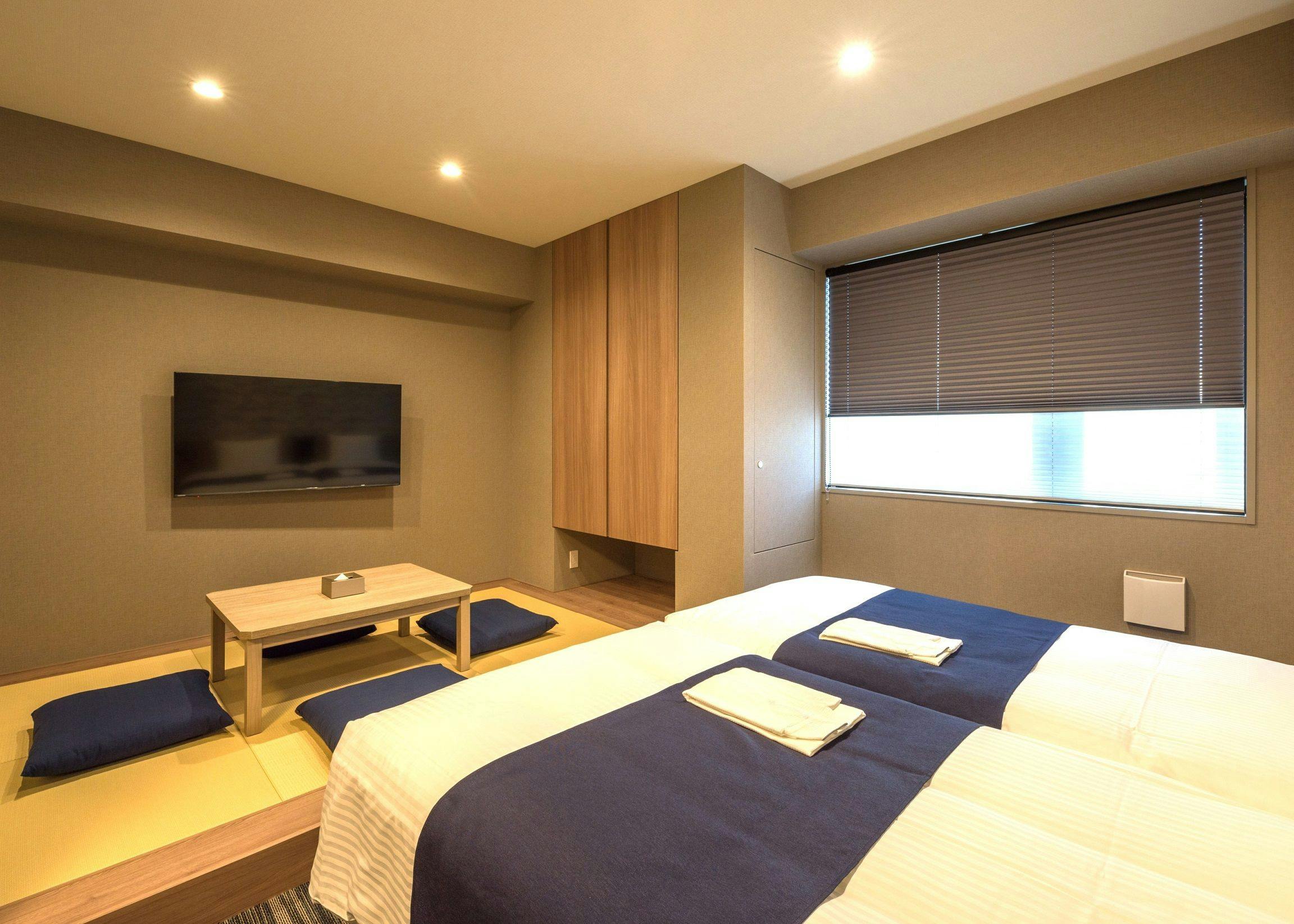 100センチ幅の正ベッド2台、ソファーベッド1台、和室に布団2組を用意しており、計5名様にてご利用可能なお部屋です。ゆっくりくつろげる畳スペースを設けたお部屋。ソファーベッド、布団をご利用いただくことで、最大5名様までご宿泊いただけます。ご家族・ご友人同士でのグループ旅行に最適です。