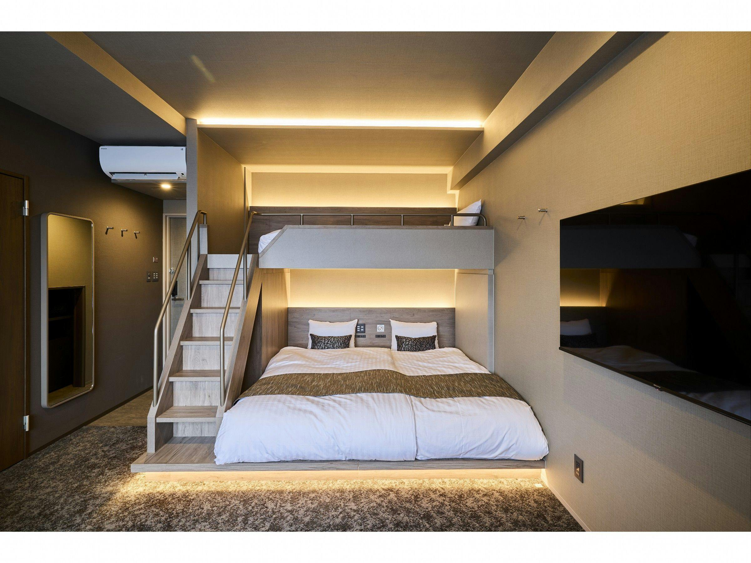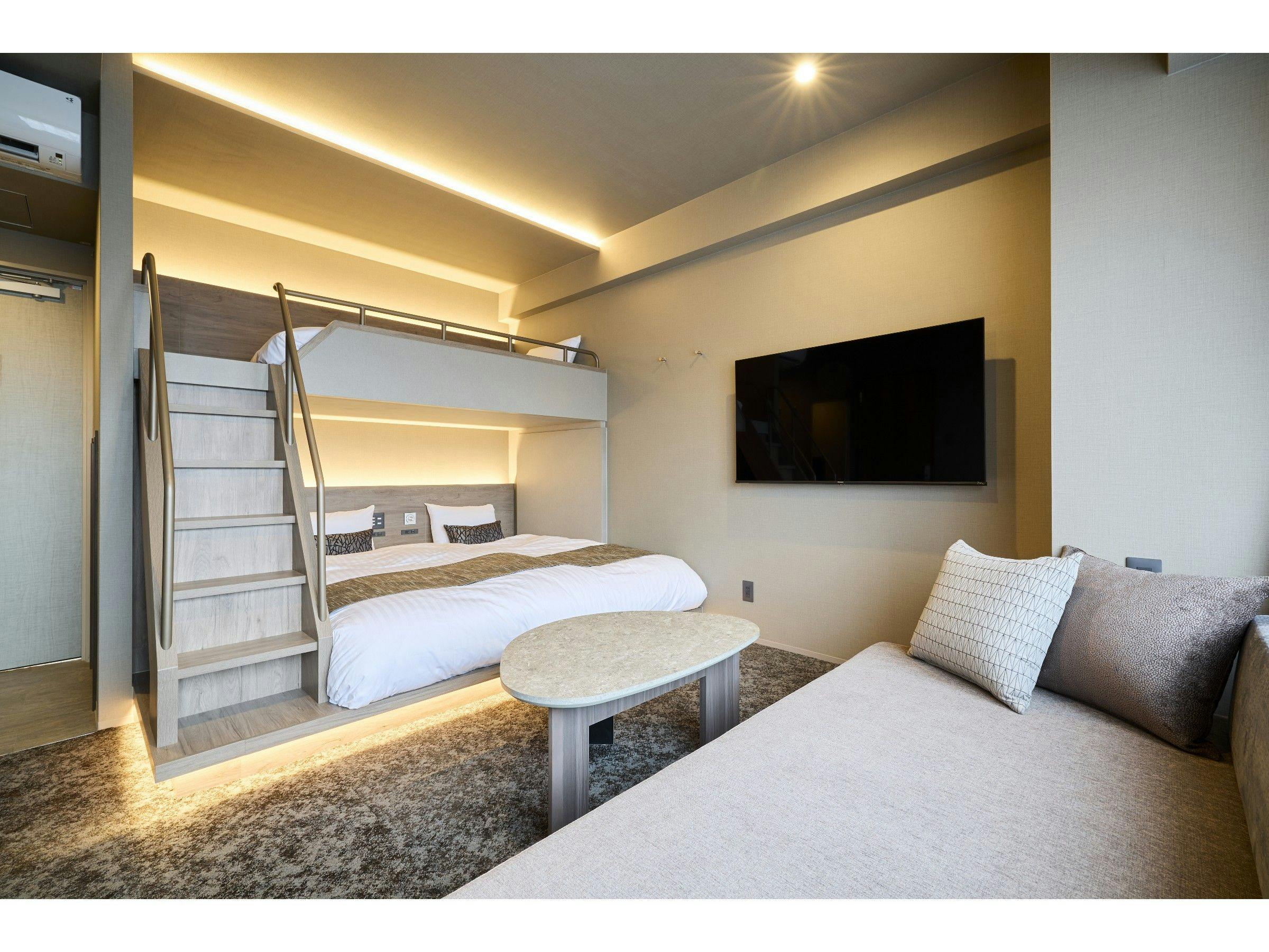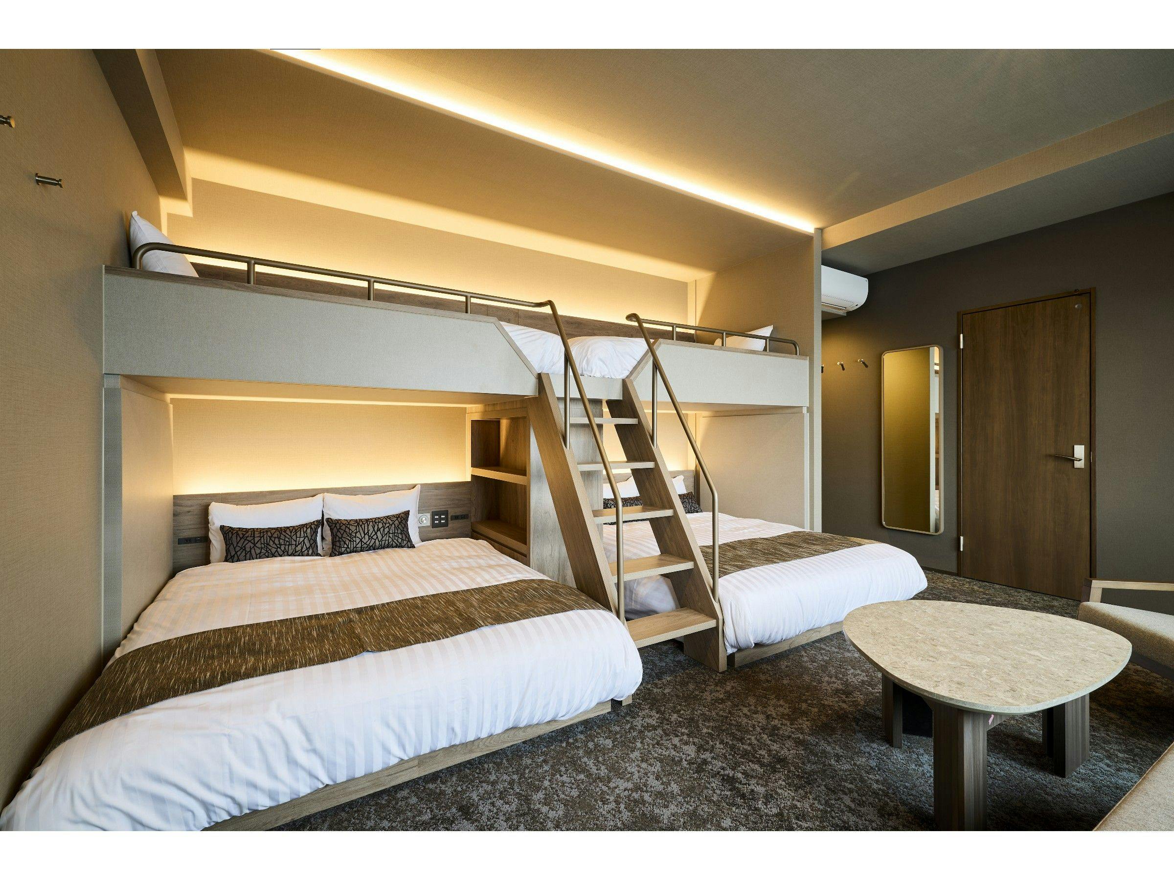 シモンズ製マットレス使用!下段クイーンベッド2台・上段シングルベッド2台浴槽付きバストイレ別ソファテーブル/椅子キッチン洗濯機