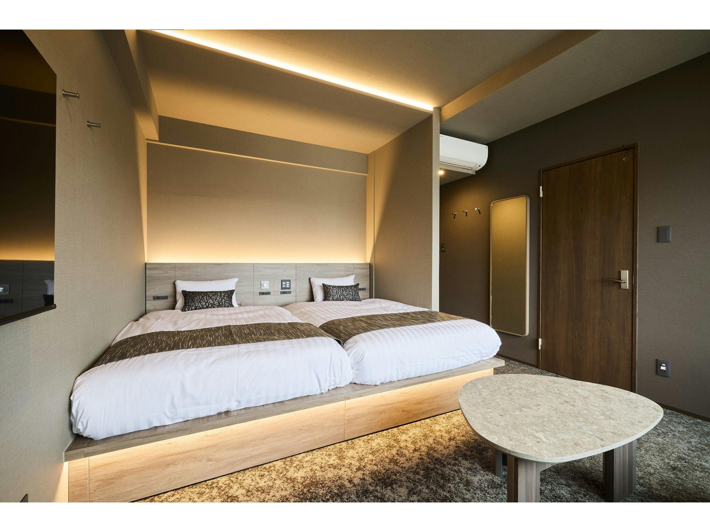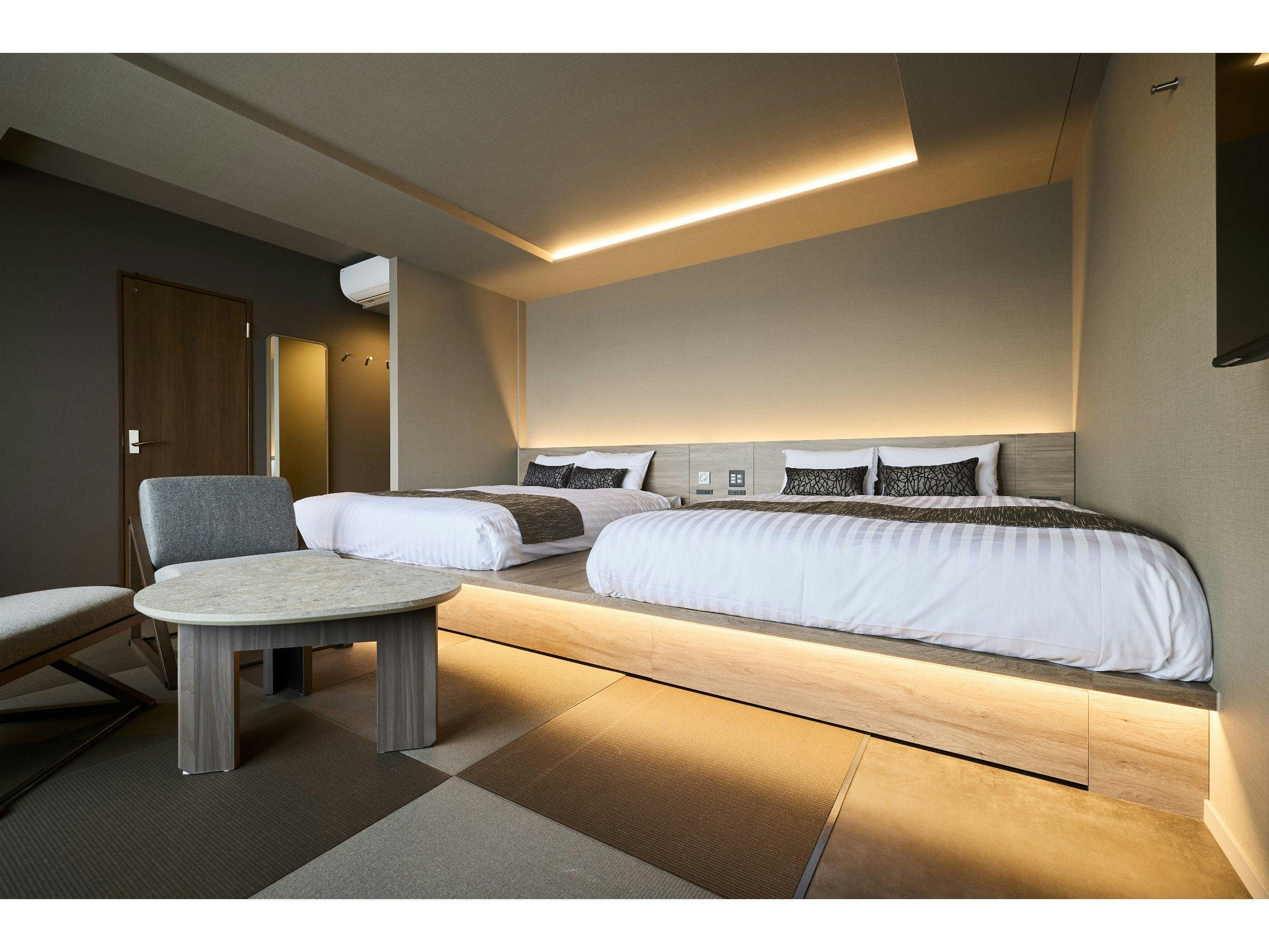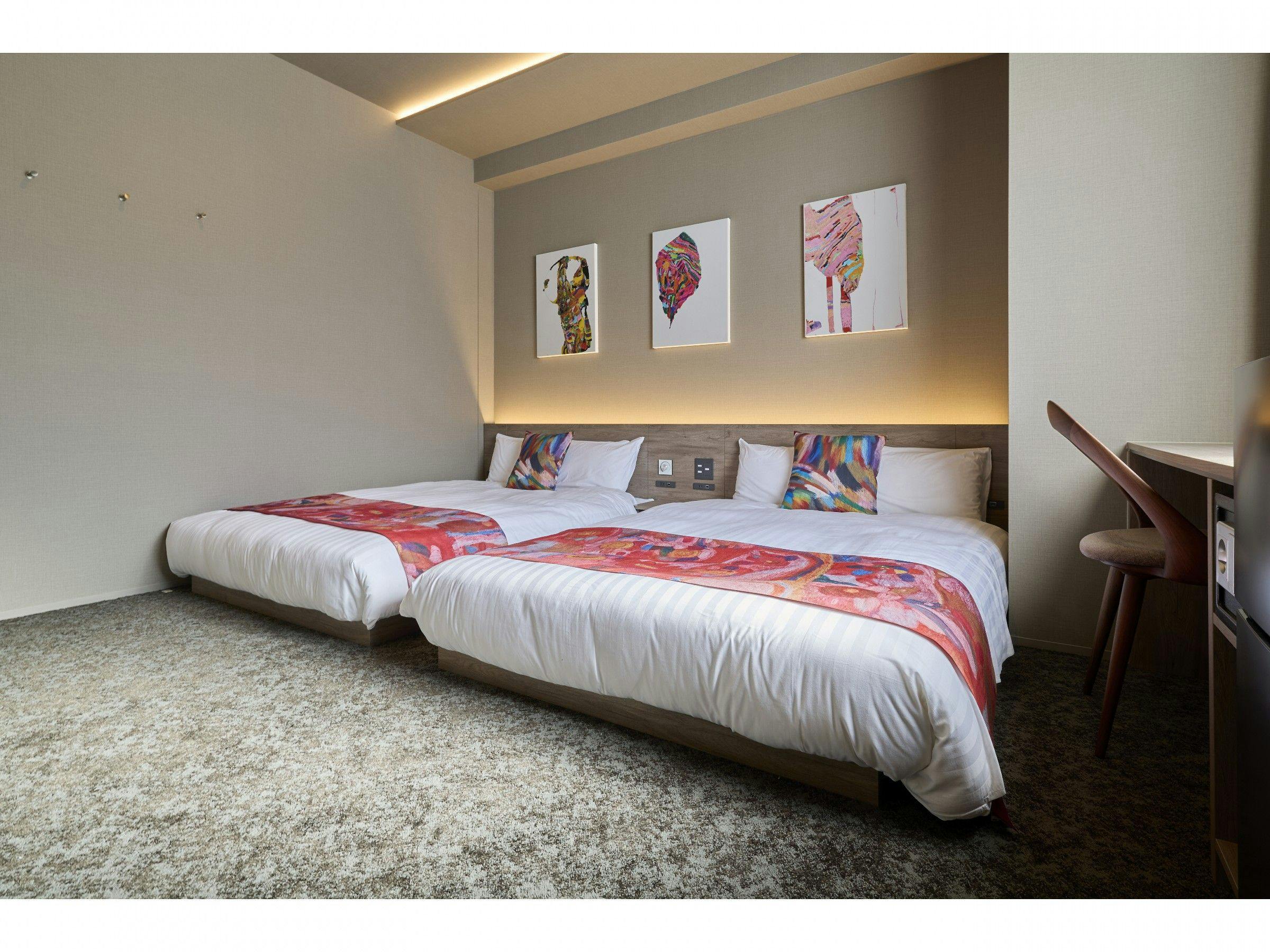 【ユニバーサルルームwithヘラルボニー】シモンズ製マットレス使用!ダブルベッド2台シャワールーム(トイレ別)ダイニングテーブル/椅子車椅子対応の客室キッチン洗濯機