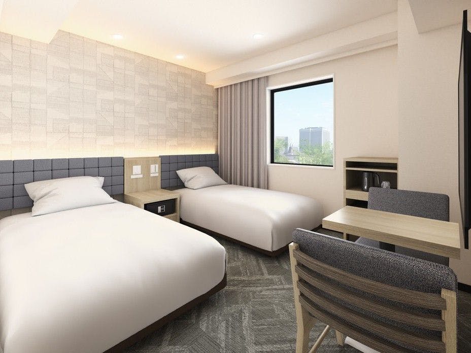 【全室禁煙】対面のテーブルをセットしたシンプルなツインルーム。お風呂とトイレはセパレート式で、洗い場のあるバスルームで快適にお過ごし頂けます。