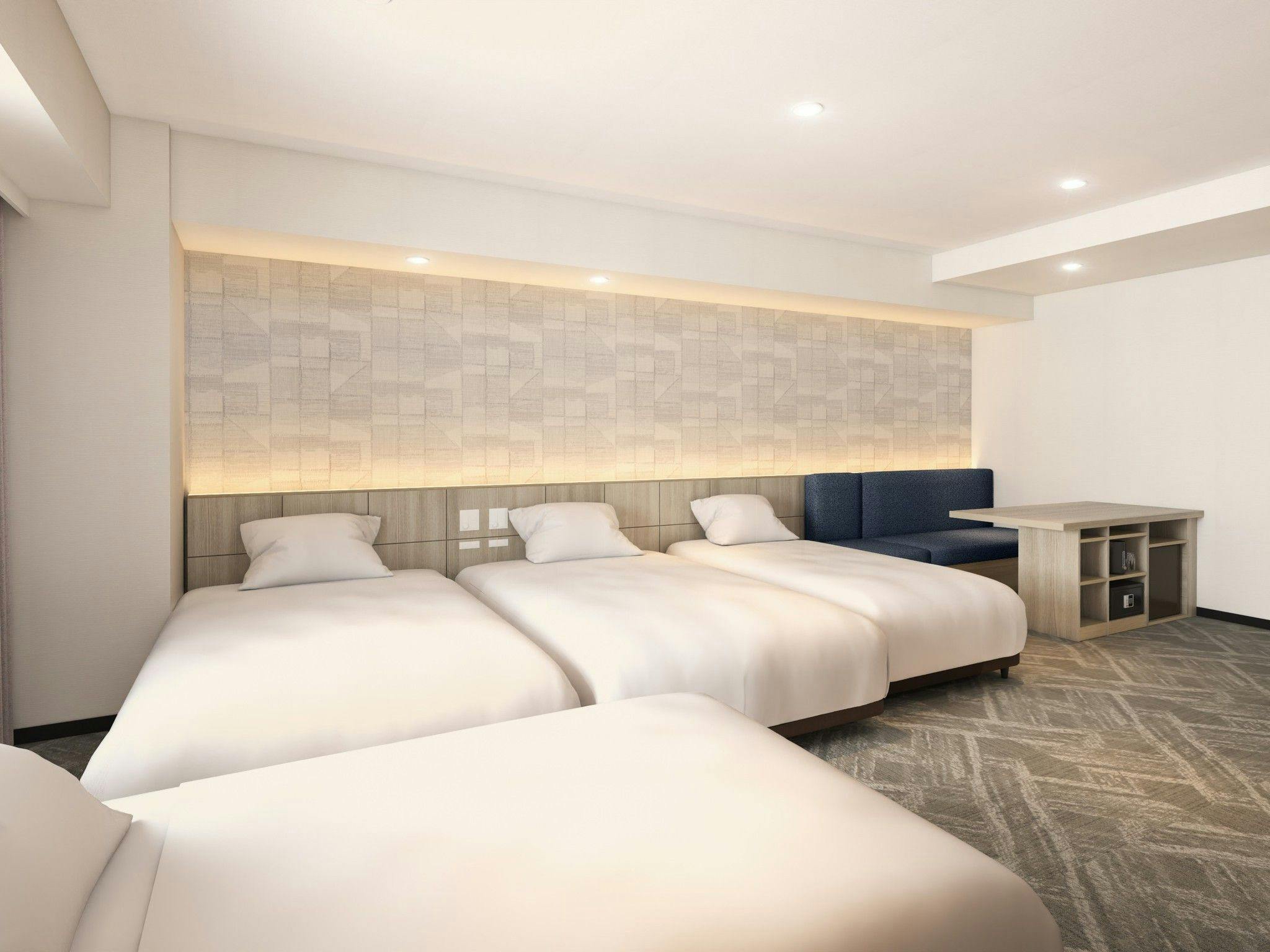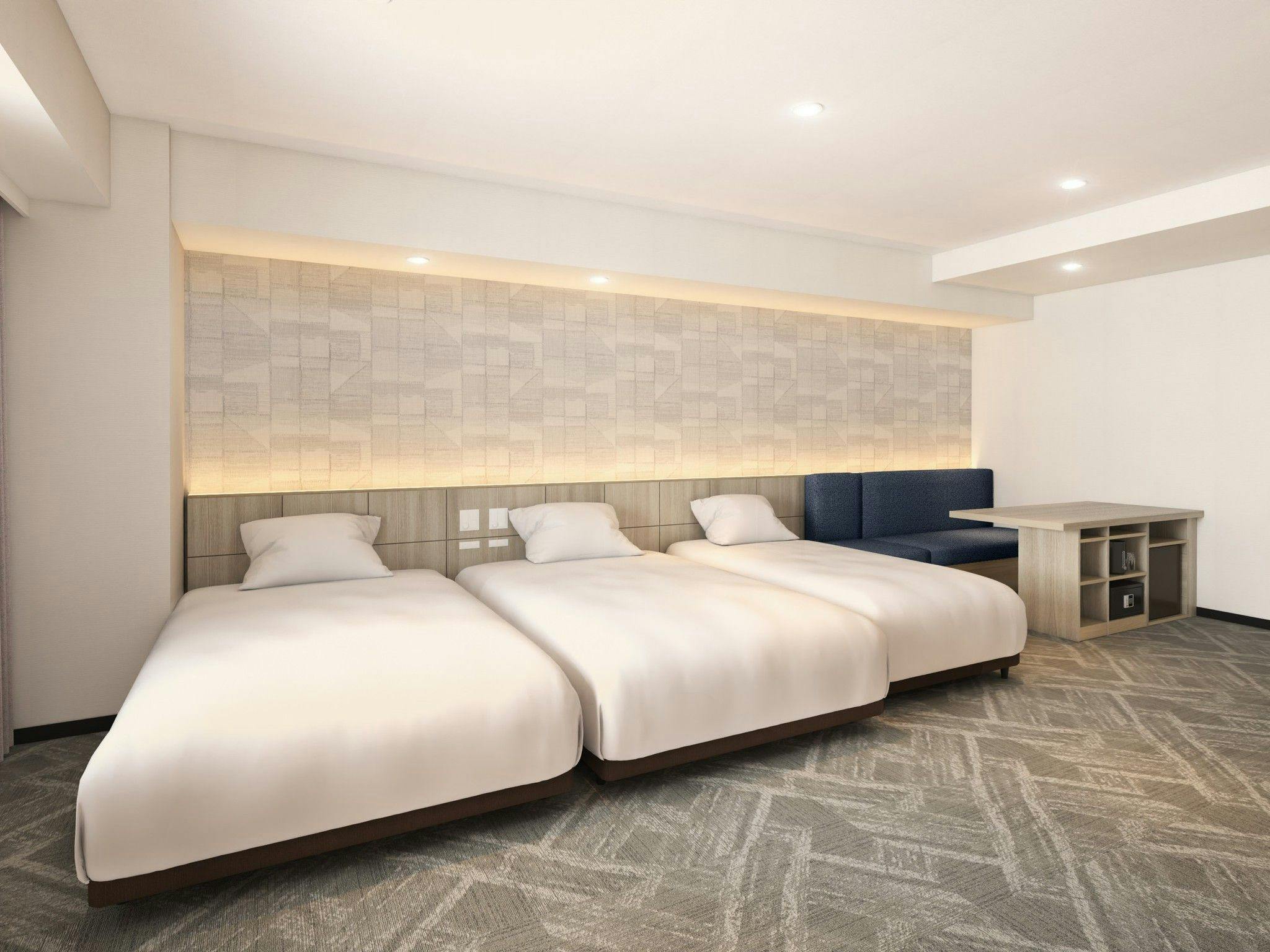 【全室禁煙】約40平米の最も広いお部屋でございます。2名様でのご利用はもちろん、ベッドは最大4台設置可能な為、ご家族やお友達とのご滞在に大変おすすめなお部屋でございます。なお、この部屋タイプではレギュラーベッド2台+スタッキングベッド(幅100センチ・長さ180センチ)2台のご利用となります。