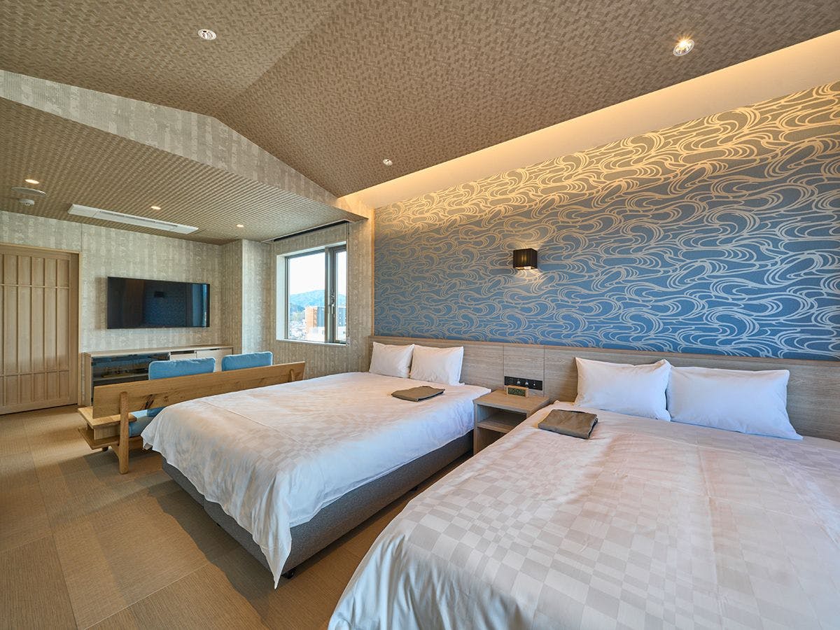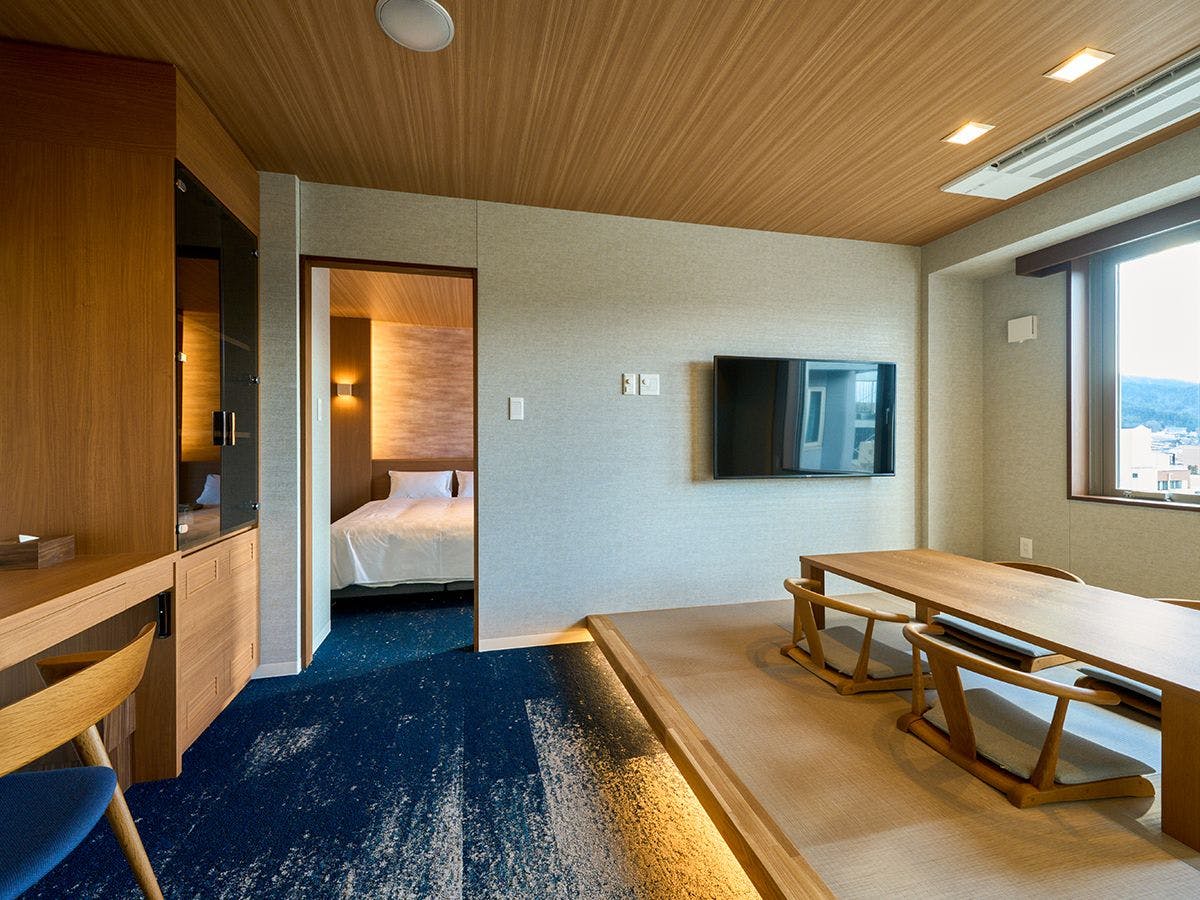 畳に座椅子でくつろげるスペース付きのリビングスペースとベッドルームを備えた特別感のある客室