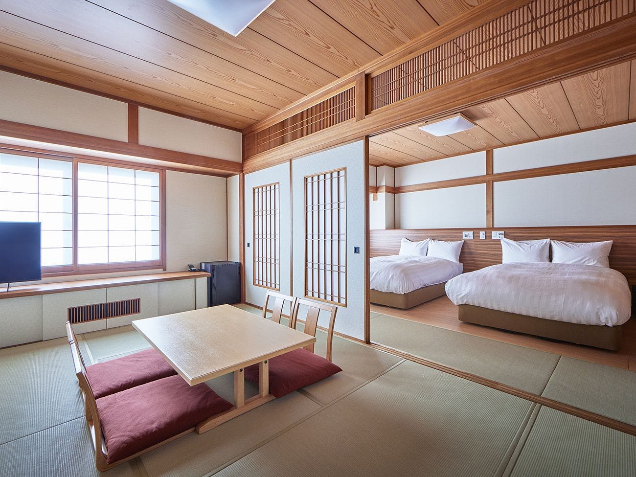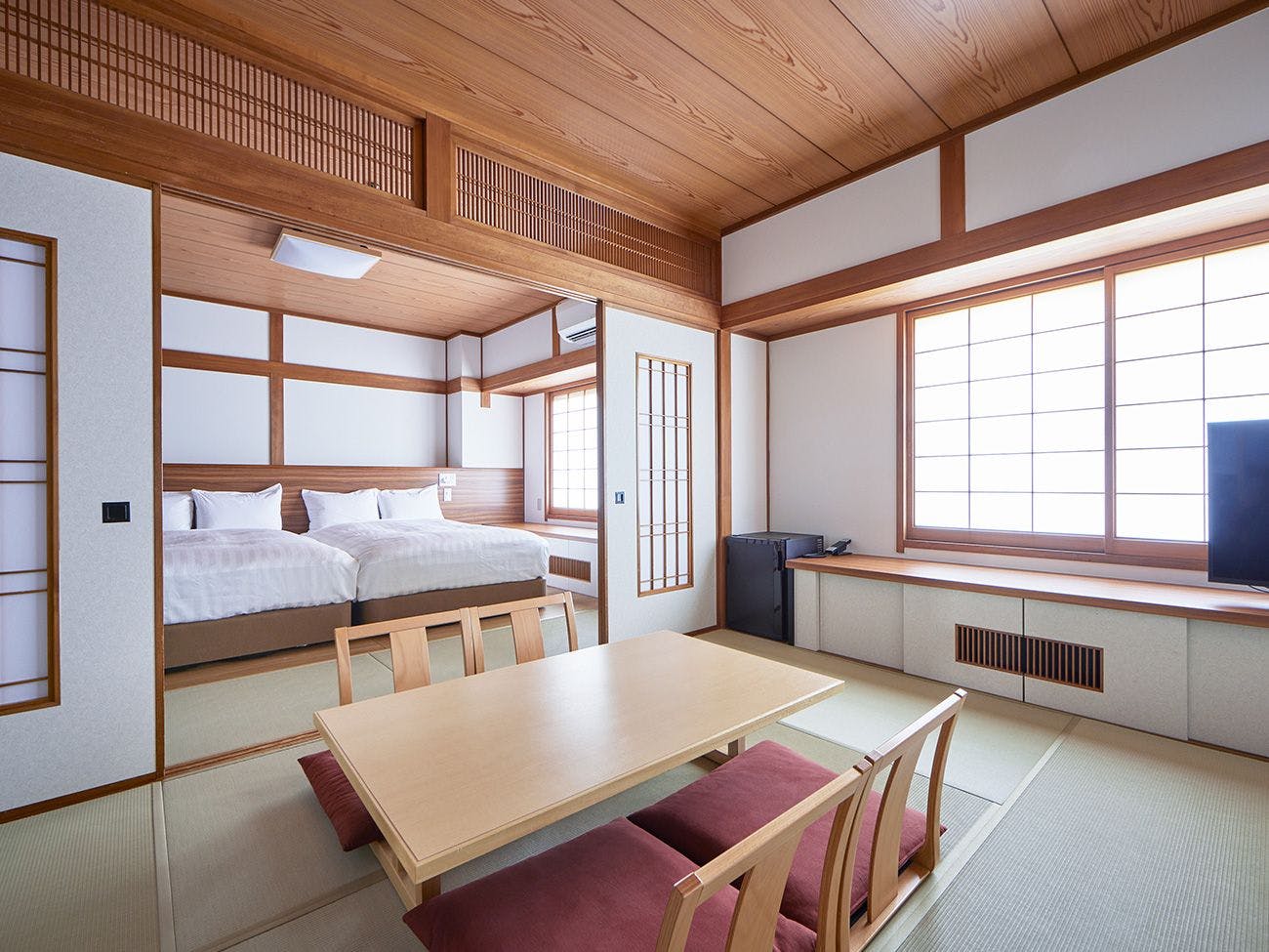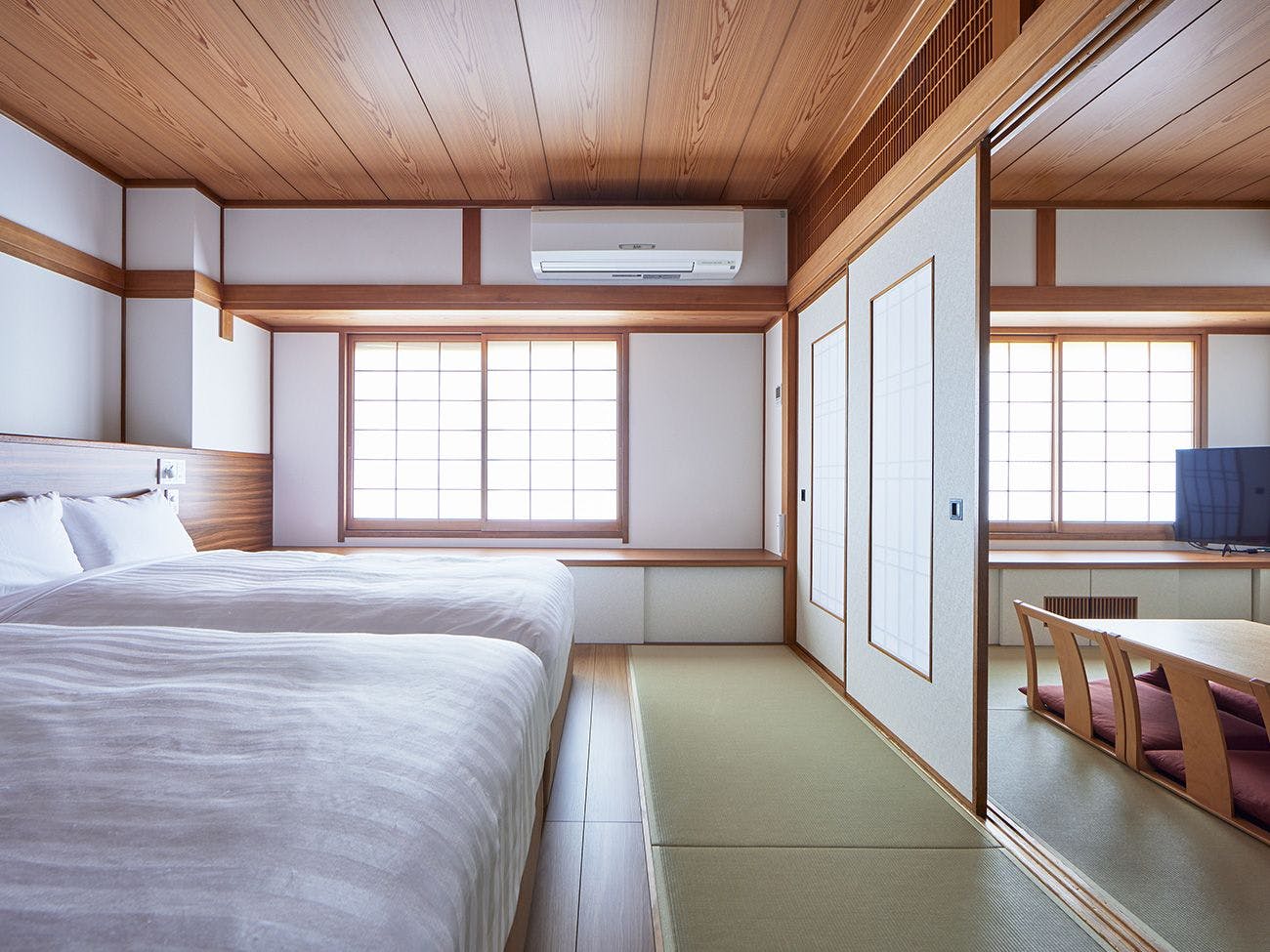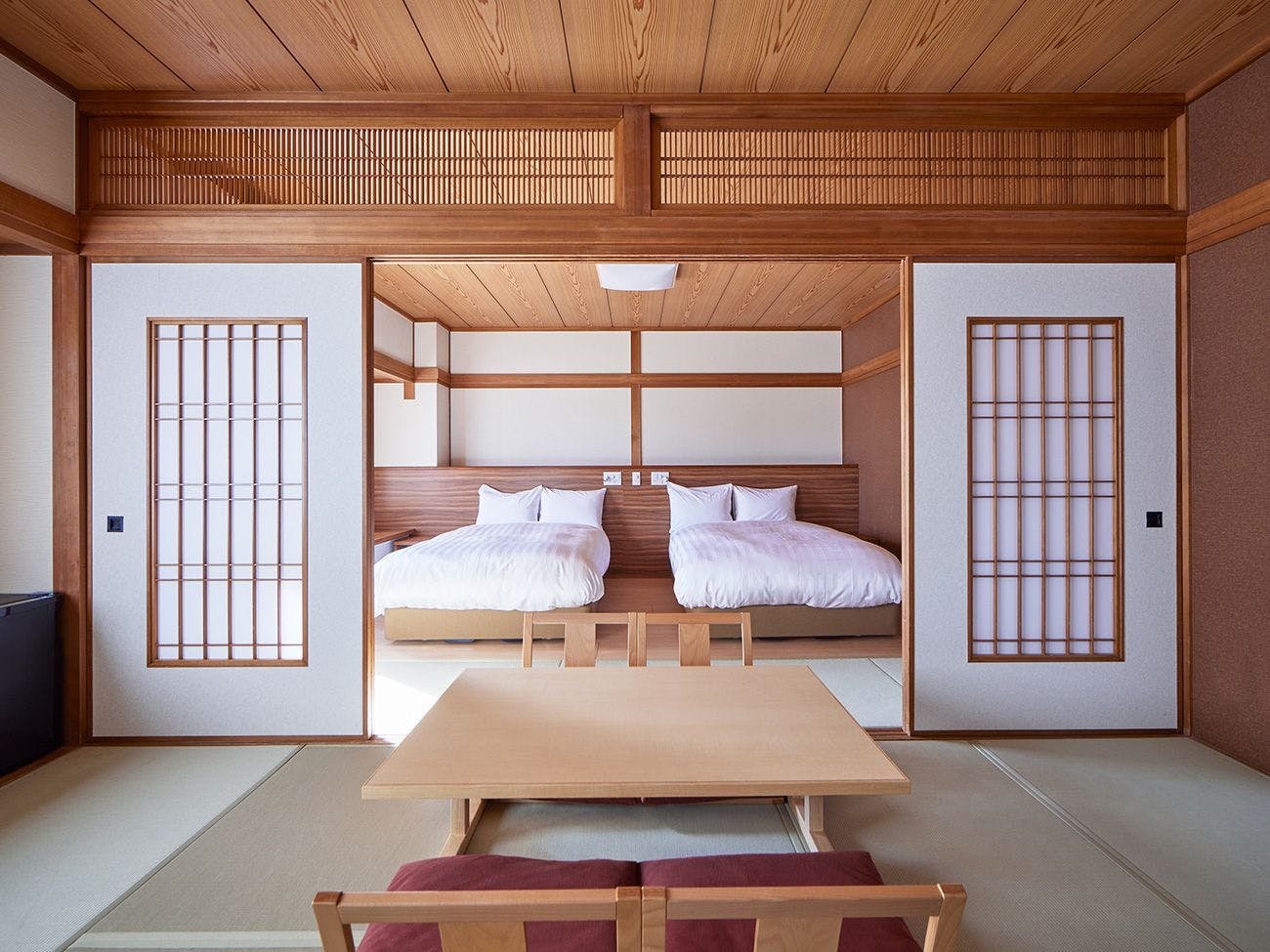■お部屋の広さ…46m2■ベッドサイズ…120×200×2台■備品…空気清浄機・電気ケトル・ドライヤー・空の冷蔵庫・シャワートイレ■2名様まではベッドですが3名様からご利用の場合はお布団でのご用意となります。